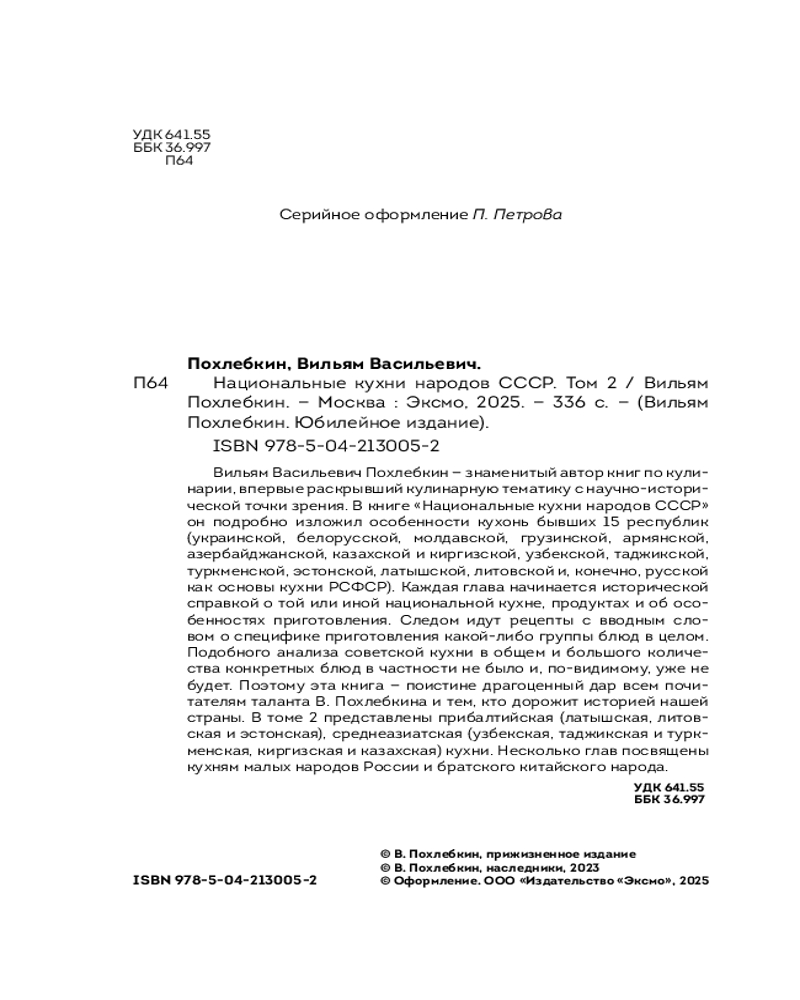 💳 Оплатить за товар можно при получении 🇰🇿 Есть бесплатная доставка по Казахстану от 1 дня 🎁 Копите бонусы с каждой покупки Серия: Вильям Похлебкин. Юбилейное издание История приготовления блюд, национальные особенности, время, посуда, продукты — обо всех тонкостях каждой из них подробно рассказано великим В. В. Похлебкиным, национальной гордостью России в области кулинарного искусства. Ведь главные отличия национальных кухонь заключаются не в том, что или из чего готовят, а каким образом, с помощью каких приемов, в какой культурной среде. Именно эти детали, эти технологические «мелочи» являются основными для формирования особого вкуса блюд. Вот почему крайне важно, читая рецепты и комментарии этого удивительного автора, обращать внимание на описание подготовки продуктов и технологию их приготовления, на особые методы и приемы кулинарной обработки, которые зачастую являются более важным условием успеха, чем состав продуктов. |