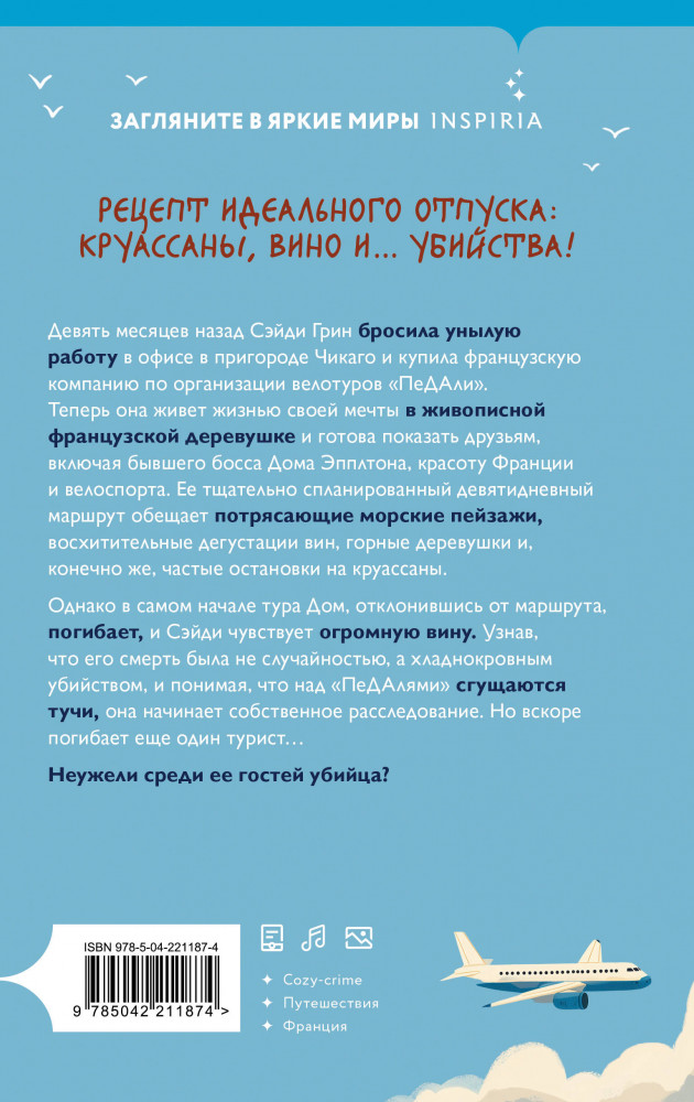💳 Оплатить за товар можно при получении 🇰🇿 Есть бесплатная доставка по Казахстану от 1 дня 🎁 Копите бонусы с каждой покупки Серия: Tok. Как раскрыть убийство: руководство для любителей Рецепт идеального отпуска: круассаны, вино и... убийства! Девять месяцев назад Сэйди Грин бросила унылую работу в офисе в пригороде Чикаго и купила французскую компанию по организации велотуров «ПеДАли». Теперь она живет жизнью своей мечты в живописной французской деревушке и готова показать друзьям, включая бывшего босса Дома Эпплтона, красоту Франции и велоспорта. Ее тщательно спланированный девятидневный маршрут обещает потрясающие морские пейзажи, восхитительные дегустации вин, горные деревушки и, конечно же, частые остановки на круассаны. |
