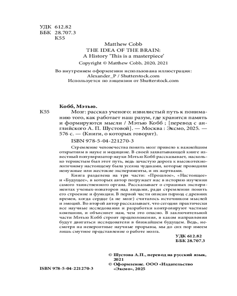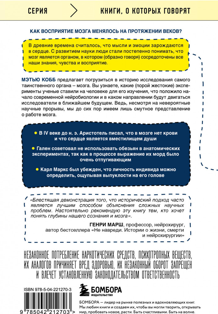 💳 Оплатить за товар можно при получении 🇰🇿 Есть бесплатная доставка по Казахстану от 1 дня 🎁 Копите бонусы с каждой покупки Серия: Книги, о которых говорят Как менялось наше представление о мозге с древних времен? Если сегодня мозг иногда называют суперкомпьютером, то раньше его сравнивали с часами, телеграфом, телефоном и гидравлическими системами. Профессор Мэтью Кобб описывает невероятные открытия, сделанные в попытках определить функции мозга, а также гениальные и шокирующие эксперименты, которые к ним привели. |