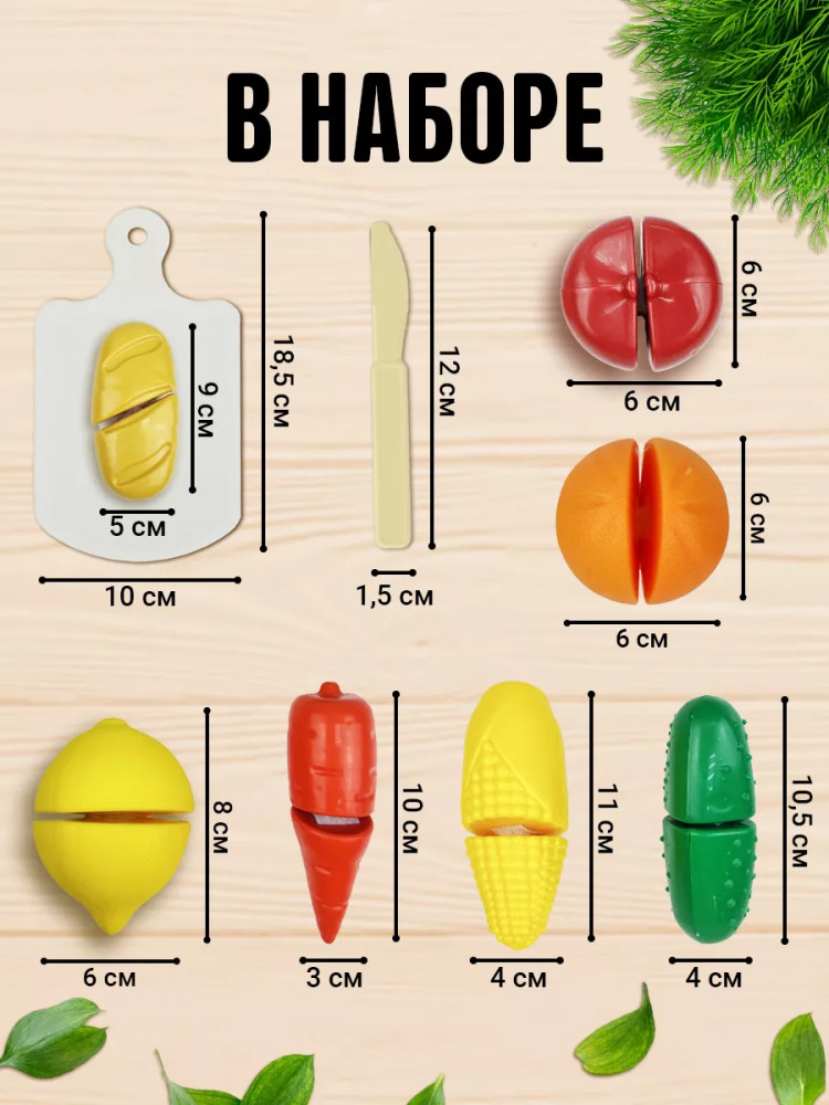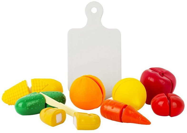 Наш пластмассовый игровой набор продуктов идеально подходит для мальчиков и девочек. В нем вы найдете игрушечные продукты, фрукты на липучках и овощи на липучках такие как: апельсин, лимон, яблоко, морковь, огурец, помидор, кукуруза, батон, а также нож и разделочную доску, чтобы удобно их нарезать. Для ребенка наши пластиковые игрушки будет легко держать в руках, они имеют яркие цвета и реалистичные формы, будто это еда.