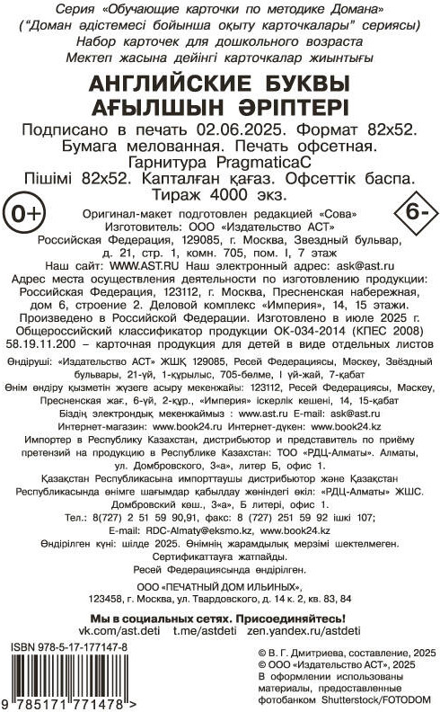 💳 Оплатить за товар можно при получении 🇰🇿 Есть бесплатная доставка по Казахстану 🎁 Копите бонусы с каждой покупки Серия: Обучающие карточки по методике Домана Выучить английский алфавит — это просто! 48 карточек «Английские буквы» — это удобный шрифт, крупные буквы с цветовым делением на гласные и согласные. Малыш «вживую» познакомится с буквами, обведёт пальчиком контуры и хвостики и благодаря этому быстрее запомнит их все. А затем, опираясь на карточки из набора, начнёт составлять первые слова. Самые используемые буквы представлены в комплекте в количестве двух или трёх штук. Игры с карточками помогут сделать первые шаги в изучении английского языка: развиваем речь, тренируем логику и зрительную память, обогащаем словарный запас и расширяем кругозор. Для дошкольного возраста. |
