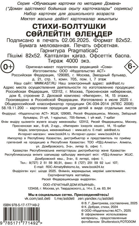 💳 Оплатить за товар можно при получении 🇰🇿 Есть бесплатная доставка по Казахстану от 1 дня 🎁 Копите бонусы с каждой покупки Серия: Обучающие карточки по методике Домана Развивающий комплект «Стихи-болтушки» — всё что нужно для игр по запуску речи у малышей. Это издание поможет ребёнку начать произносить первые слова и разговориться. Это не просто карточки со стихами для детей — это пособие по развитию речи для самых маленьких. Стихи в этом комплекте особенные — логопедические, игровые. Каждый стишок стимулирует речевую активность малыша и помогает прорабатывать звуки: строчки-говорилки выделены цветом. Карточки выполнены на матовом мелованном картоне качества премиум. Благодаря высокому качеству печати краски не выцветут, и набор карточек долгое время будет радовать и маленьких, и взрослых. Для дошкольного возраста. |