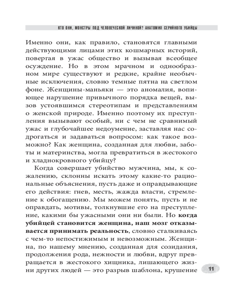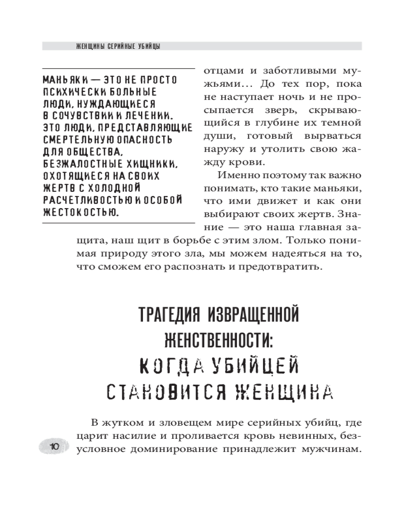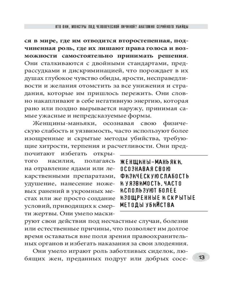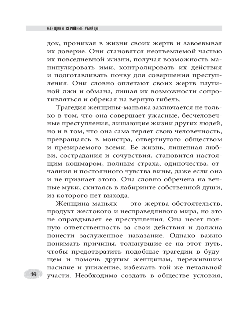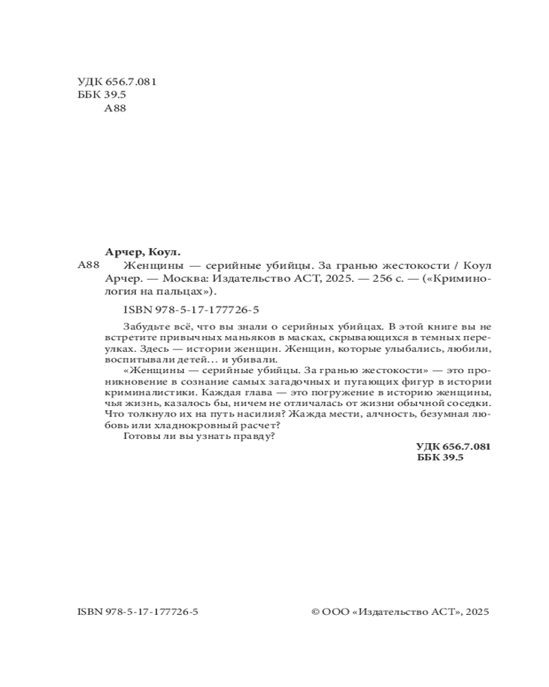 💳 Оплатить за товар можно при получении 🇰🇿 Есть бесплатная доставка по Казахстану от 1 дня 🎁 Копите бонусы с каждой покупки Серия: Криминология на пальцах Забудьте все, что вы знали о серийных убийцах. В этой книге вы не встретите привычных маньяков в масках, скрывающихся в темных переулках. Здесь — истории женщин. Женщин, которые улыбались, любили, воспитывали детей... и убивали. «Женщины — серийные убийцы. За гранью жестокости» — это проникновение в сознание самых загадочных и пугающих фигур в истории криминалистики. Каждая глава — это погружение в историю женщины, чья жизнь, казалось бы, ничем не отличалась от жизни обычной соседки. Что толкнуло их на путь насилия? Жажда мести, алчность, безумная любовь или хладнокровный расчет? Готовы ли вы узнать правду? |