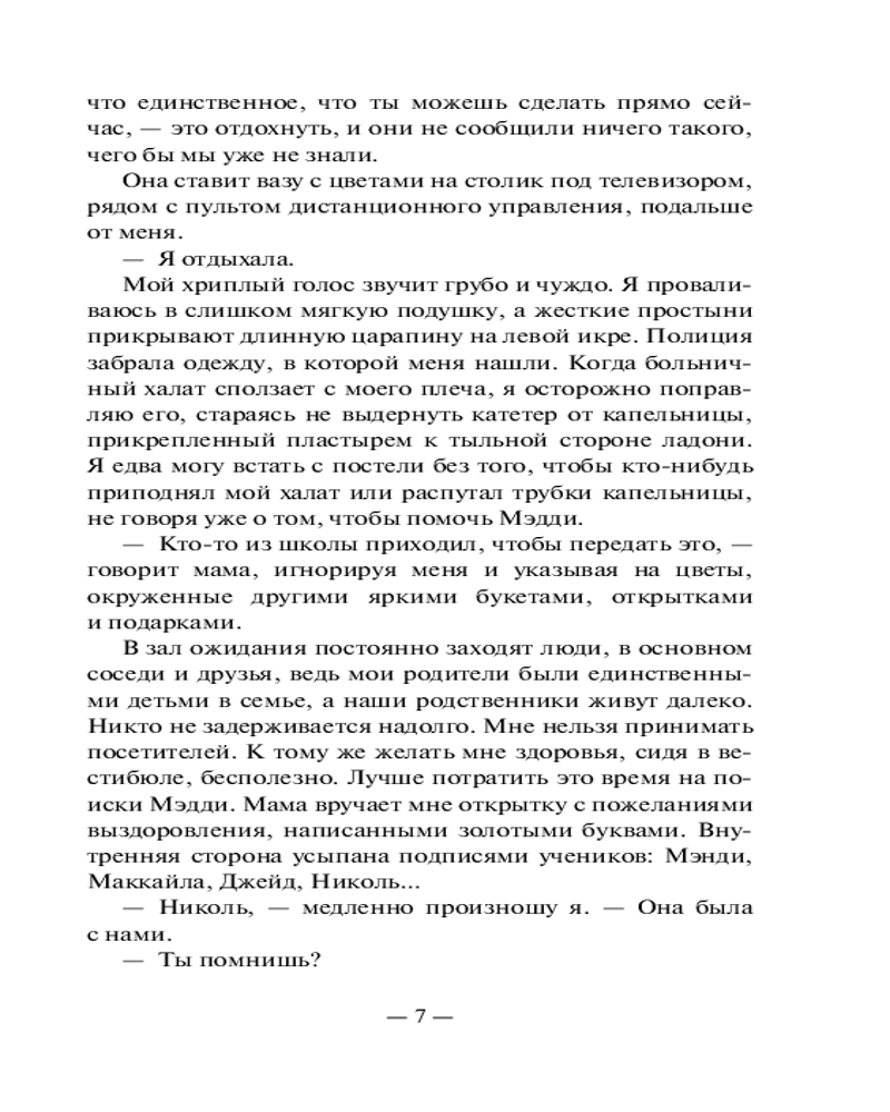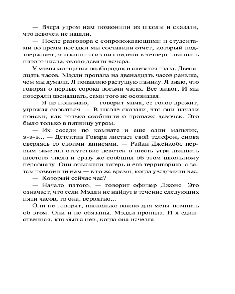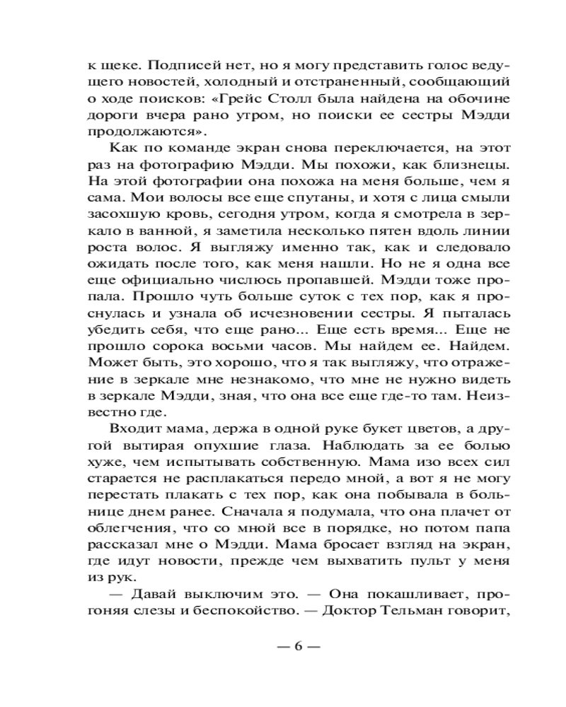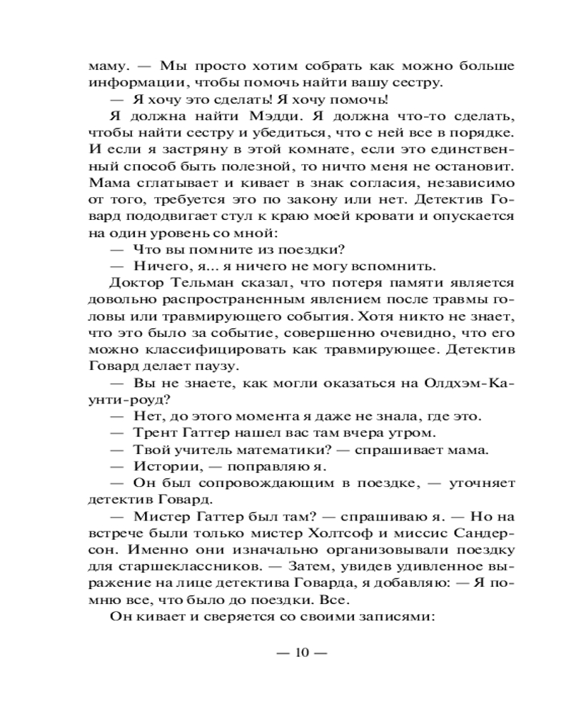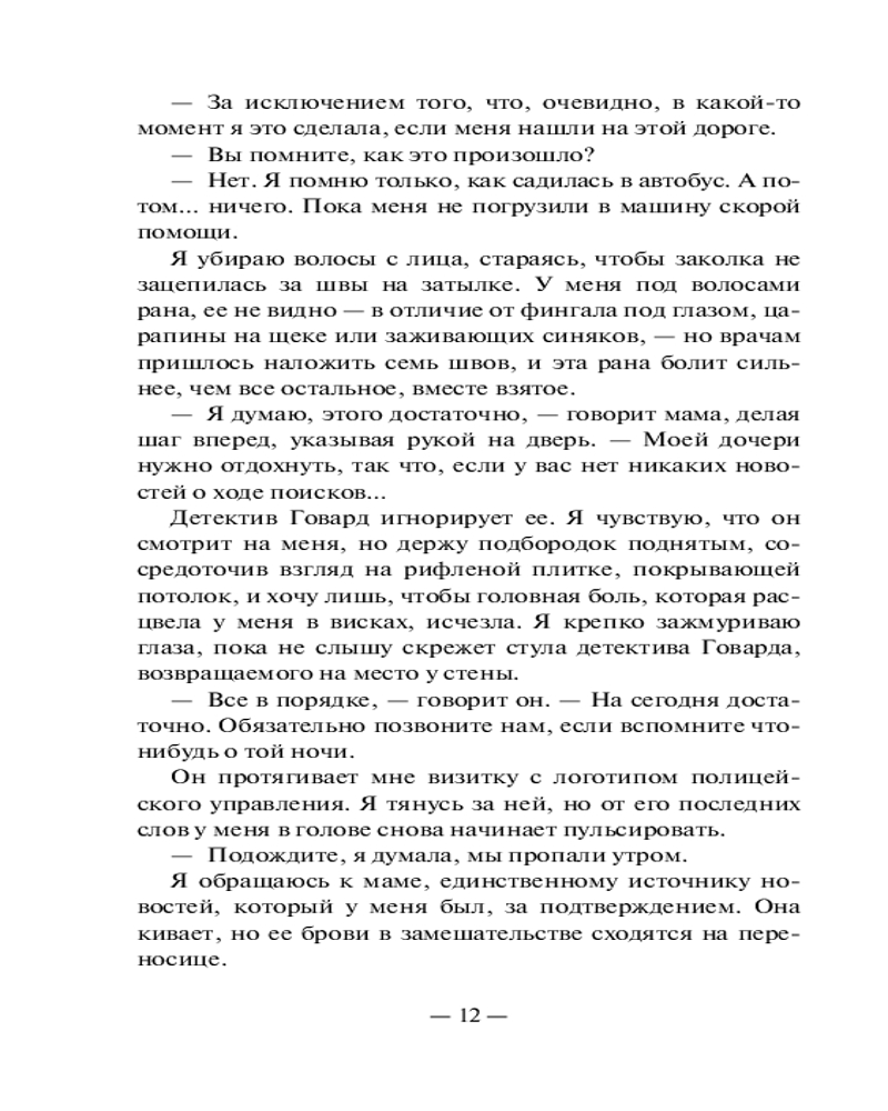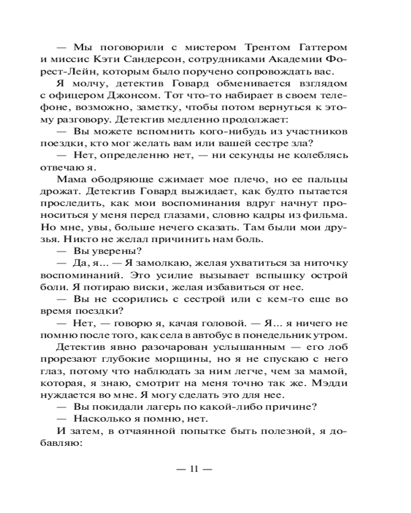 💳 Оплатить за товар можно при получении 🇰🇿 Есть бесплатная доставка по Казахстану от 1 дня 🎁 Копите бонусы с каждой покупки Серия: Neoclassic: Расследование Две сестры пропали во время школьной поездки. Общительная спортсменка Грейс и тихоня Мэдди, предпочитающая дневник обществу одноклассников и мечтающая хоть немного быть похожей на свою сестру. Но когда находят лишь Грейс — раненую и не помнящую, что произошло, — все думают, что она лжет. Ведь на ее одежде найдена кровь Мэдди... Отчаянно пытаясь узнать правду и доказать собственную невиновность, Грейс решает собрать воедино все, что произошло в этой поездке. Но вскоре она узнает, что ее собственные секреты могут оказаться самыми страшными из всех... |
