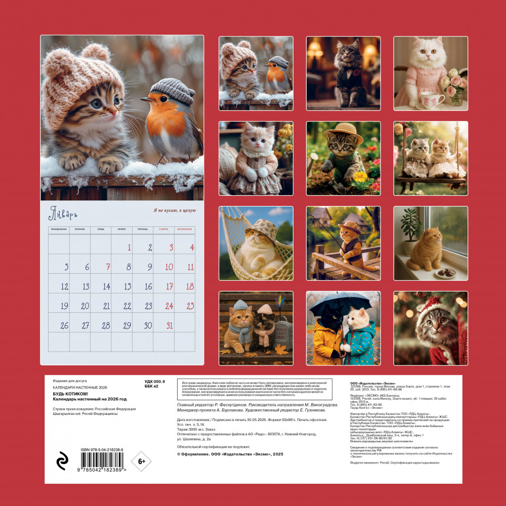Календарь настенный на 2026 год «Будь котиком»В данный момент этот товар отсутствует в продаже. Возможно, у нас найдется аналогичный или похожий товар здесь. Серия: Календари настенные 2026 (300×300) Наши настенные календари отличаются высоким качеством исполнения! Тщательно подобранные иллюстрации, напечатанные на глянцевой бумаге высочайшего качества, станут настоящим украшением дома, а в календарной сетке найдется место для ваших планов: большие клетки позволят делать записи и организовать свой год! |