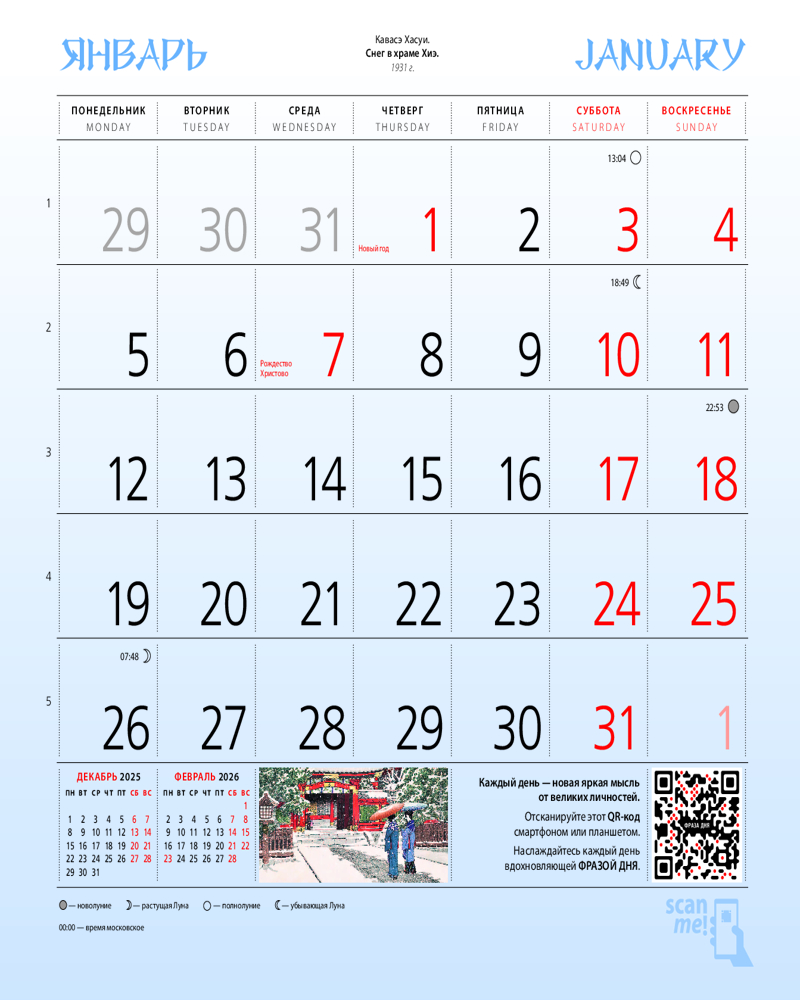 Календарь настенный на 2026 год «Шедевры японского искусства»В данный момент этот товар отсутствует в продаже. Возможно, у нас найдется аналогичный или похожий товар здесь. Серия: Календари настенные 2026 (300×300) Наши настенные календари отличаются высоким качеством исполнения! Тщательно подобранные иллюстрации, напечатанные на глянцевой бумаге высочайшего качества, станут настоящим украшением дома, а в календарной сетке найдется место для ваших планов: большие клетки позволят делать записи и организовать свой год! |