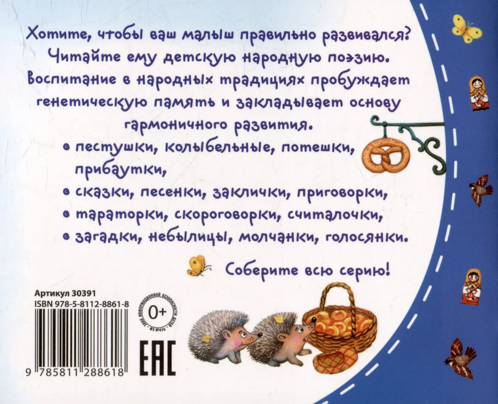 💳 Оплатить за товар можно при получении 🇰🇿 Есть бесплатная доставка по Казахстану от 1 дня 🎁 Копите бонусы с каждой покупки Серия: Книжки-малышки Книжка представляет собой сборник русских народных прибауток. Прибаутки — это короткие сказки в стихах с шутливым содержанием. Их герои — люди и животные, с которыми происходят невероятные истории. Простая рифма и ритм, повторяющиеся строчки помогают быстро запомнить весёлые сказки. Воспитание детей в народных традициях пробуждает генетическую память и закладывает основу гармоничного развития. Адресовано детям от 2 лет. |