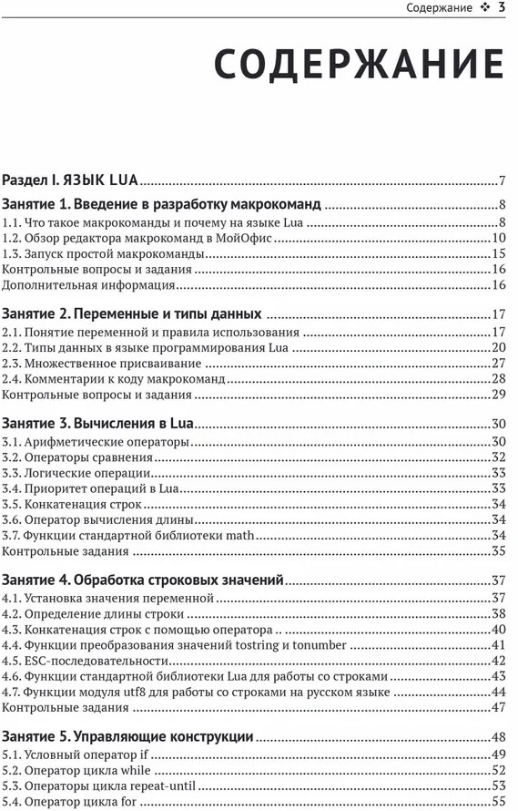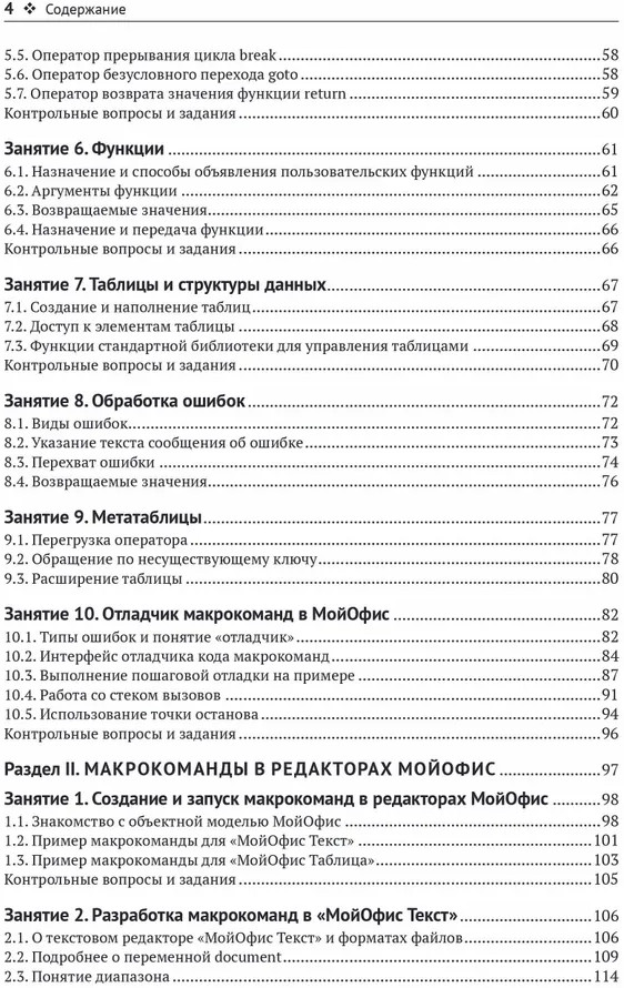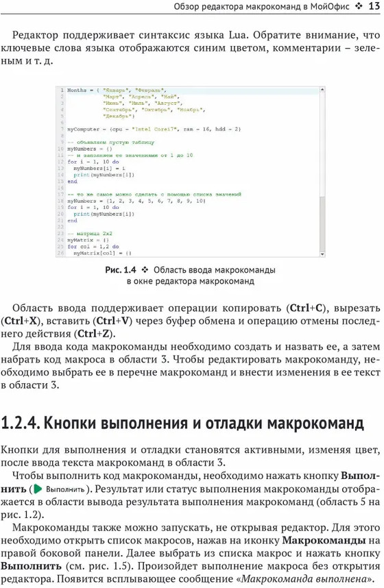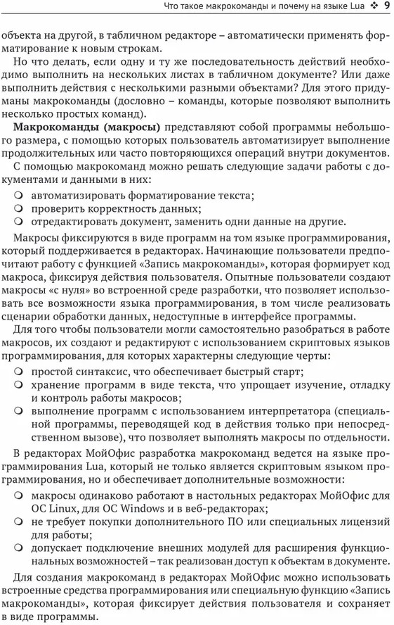 💳 Оплатить за товар можно при получении 🇰🇿 Есть бесплатная доставка по Казахстану от 1 дня 🎁 Копите бонусы с каждой покупки Книга содержит описание языка Lua в объеме, необходимом для создания макрокоманд, а также описание объектной модели МойОфис — таблиц и функций, используемых для работы с электронными документами. В нескольких главах рассматривается работа с абзацами, списками, табличными листами и диапазонами, инструментами для рецензирования документов и пр. В конце каждой главы представлены контрольные вопросы и задания для самопроверки. Освоив книгу, вы сможете создавать собственные макрокоманды для автоматизации рабочих процессов с помощью продуктов МойОфис. |