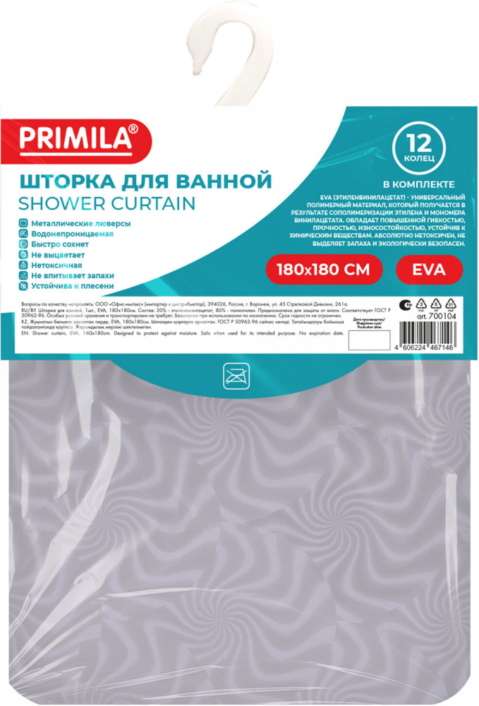 Шторка для ванной комнаты PRIMILA — залог чистоты и уюта ванной комнаты. Используется для защиты пола, стен, мебели и зеркала от брызг. Эта шторка идеально впишется в любой интерьер. Шторка для ванной PRIMILA изготовлена из качественного, практичного, износостойкого, абсолютно нетоксичного материала EVA, что гарантирует отсутствие заломов и водонепроницаемость. Быстро сохнет, не шуршит, без запаха и приятная на ощупь. Шторка максимально проста в уходе — достаточно протереть ее влажной губкой.