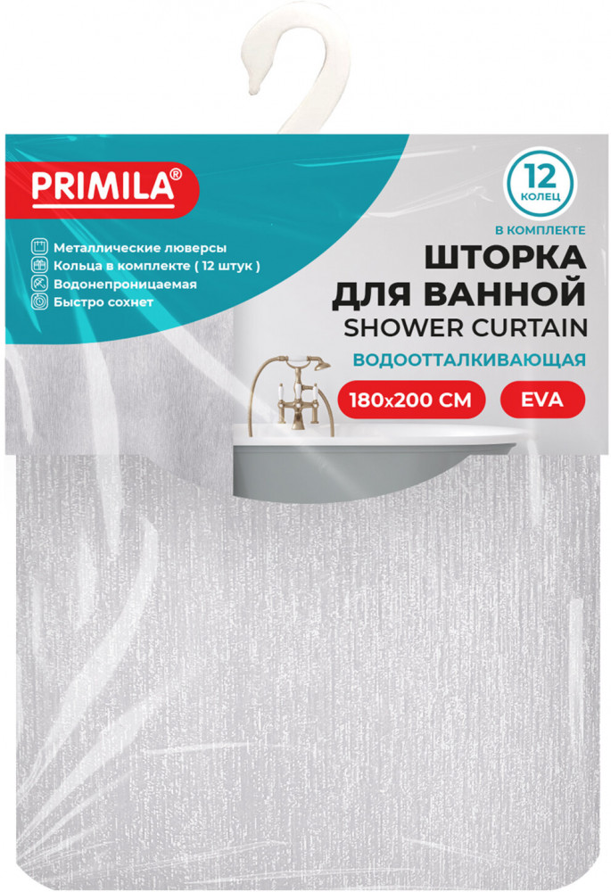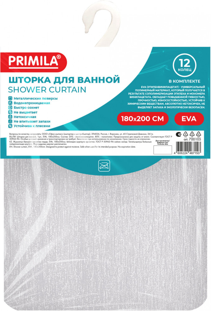 Шторка для ванной комнаты PRIMILA — залог чистоты и уюта ванной комнаты. Используется для защиты пола, стен, мебели и зеркала от брызг. Эта шторка идеально впишется в любой интерьер. Шторка для ванной PRIMILA изготовлена из качественного, практичного, износостойкого, абсолютно нетоксичного материала EVA, что гарантирует отсутствие заломов и водонепроницаемость. Быстро сохнет, не шуршит, без запаха и приятная на ощупь. Шторка максимально проста в уходе — достаточно протереть ее влажной губкой.