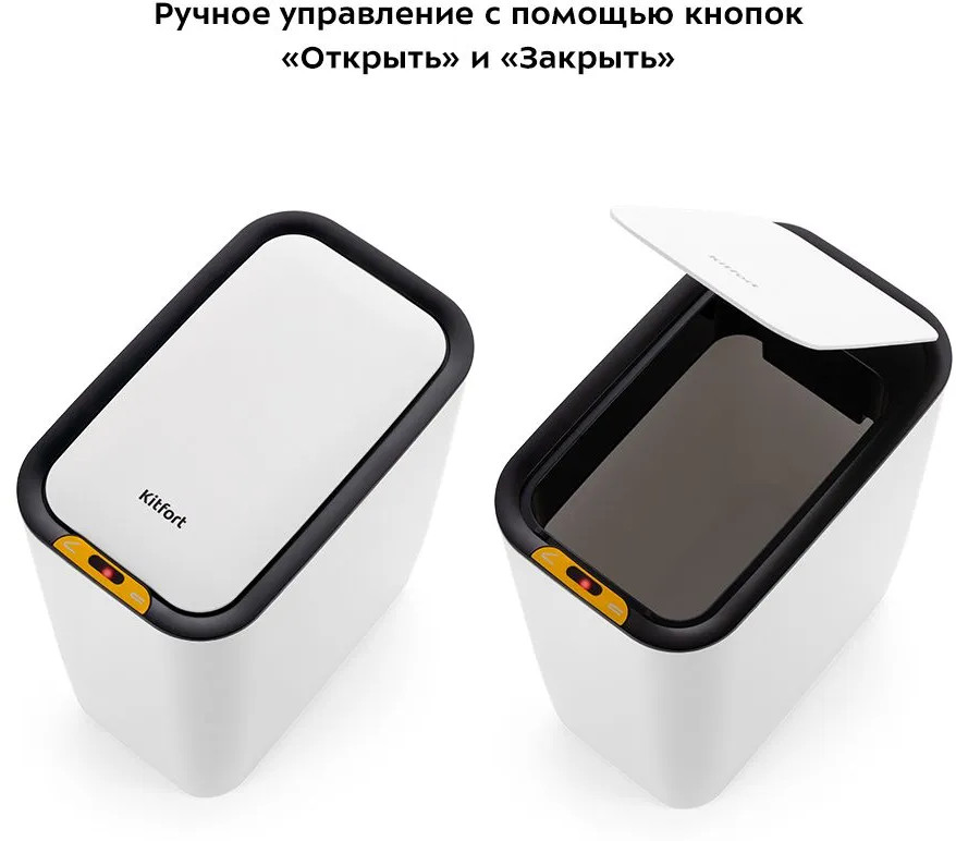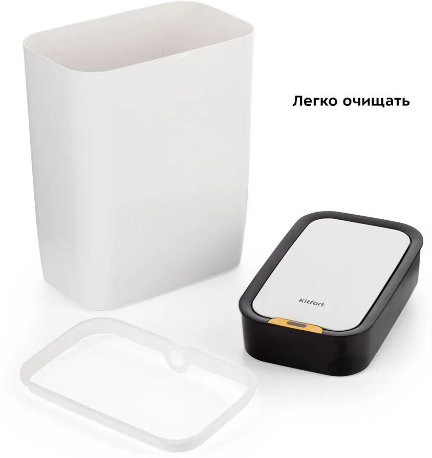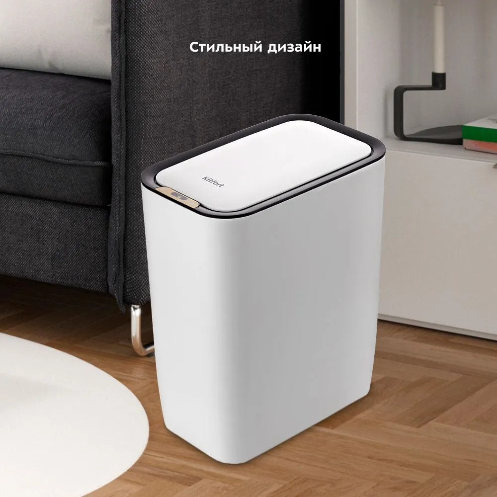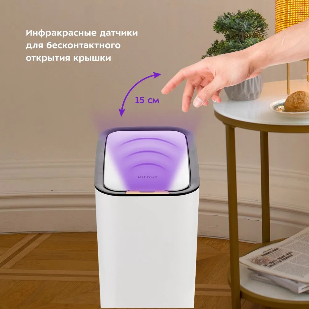 Пластиковое ведро ёмкостью 8 л легко очистить и помыть при необходимости. Своевременно очищайте внутреннее ведро от мусора во избежание появления неприятного запаха. Чтобы выбросить мусор, вам больше не нужно поднимать крышку или нажимать на педаль. Достаточно просто провести рукой над датчиком на высоте 15 см. КТ-6019 выполнено в светлом минималистичном дизайне и легко впишется в интерьер вашего дома.