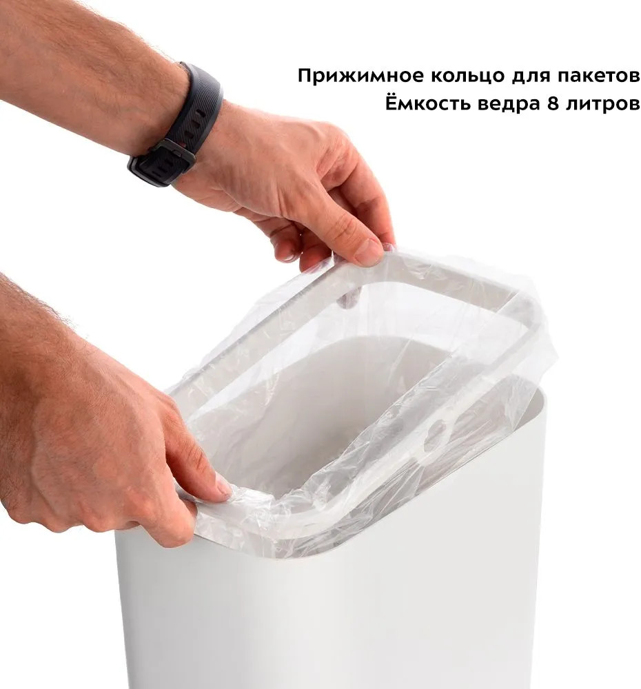 Также откидная крышка открывается при нажатии на кнопку «Открыть» и закрывается при нажатии на кнопку «Закрыть». Крышка автоматически закроется через 1,5 минуты после нажатия на кнопку «Открыть». Внутри мусорного ведра находится прижимное кольцо, благодаря которому удобно устанавливать в ведро пакеты для мусора. Ёмкость ведра 8 литров.