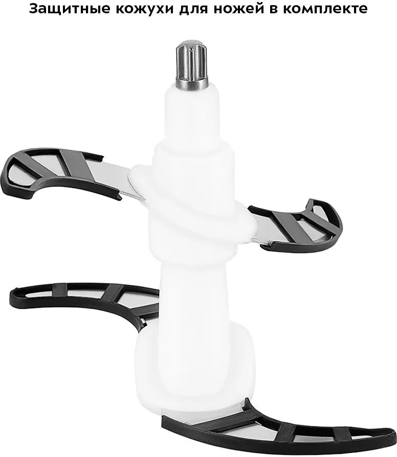 Благодаря форме ножей и их взаимному расположению, измельчение продуктов проходит быстро и по всей высоте чаши, обеспечивая однородные измельчение всей массы продуктов. Блок ножей разборный, поэтому их легко и просто мыть. Для обеспечения безопасности в комплекте с измельчителем идут защитные кожухи для ножей.