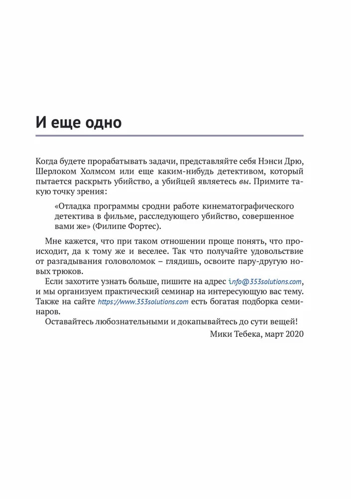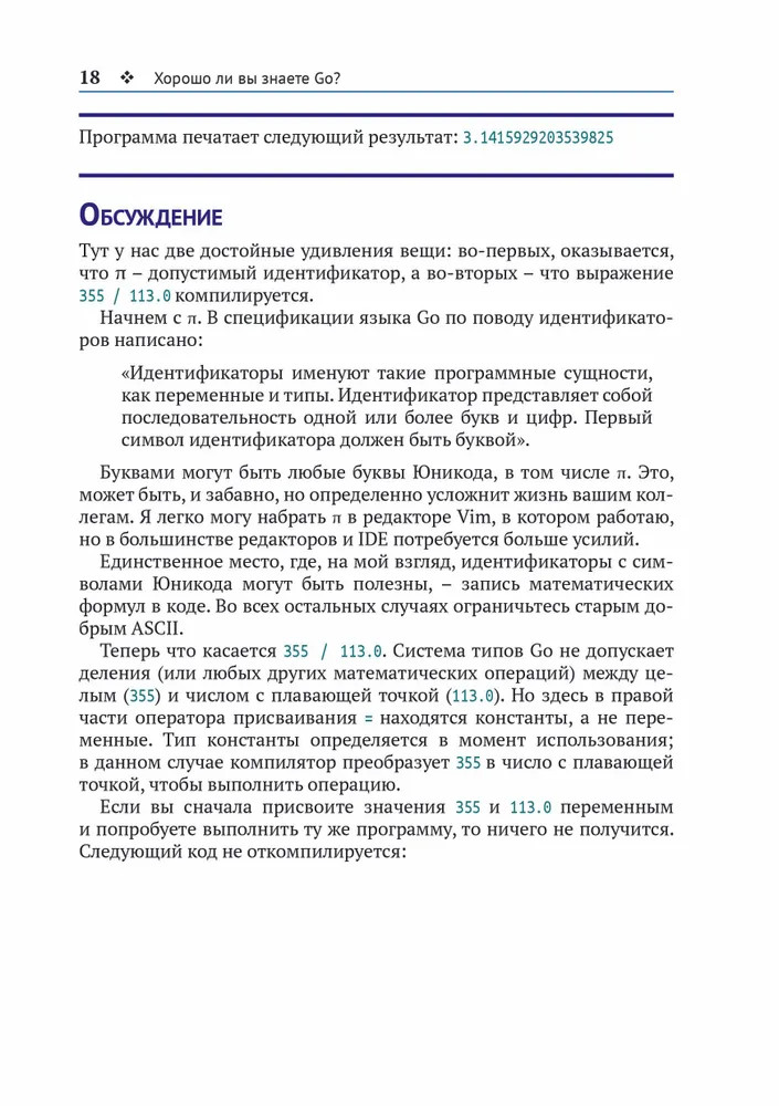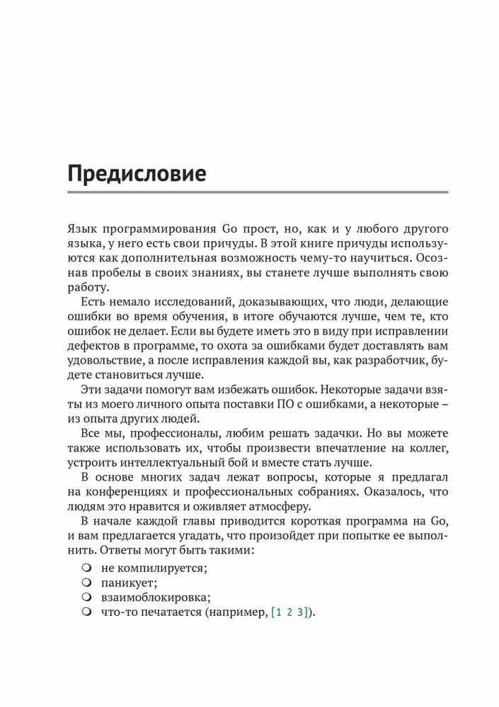 💳 Оплатить за товар можно при получении 🇰🇿 Есть бесплатная доставка по Казахстану 🎁 Копите бонусы с каждой покупки Программисты любят язык Go (golang) за эффективность и простоту. Но это не значит, что программирование на Go лишено странностей. Например, скрытые зависимости могут застать компилятор врасплох, а некоторые преобразования типов отличаются от принятых в таких популярных языках, как Python. Книга содержит 25 коротких нестандартных примеров кода для проверки вашего понимания языка Go. Решение задач с подвохом — не только надежный способ овладеть новыми знаниями, чтобы лучше справляться с работой, но и прекрасное развлечение. Задачи основаны как на собственном опыте автора по отладке программ, так и на опыте других людей. Ознакомьтесь с коротким кодом, написанным на Go, попробуйте угадать, что он выведет на печать при выполнении, запустите программу, а затем переверните страницу и прочитайте ответ и объяснение. Проверьте свои навыки работы с целыми числами, строками и символами Юникода, оцените знание поведения компилятора и многих других нюансов программирования. |