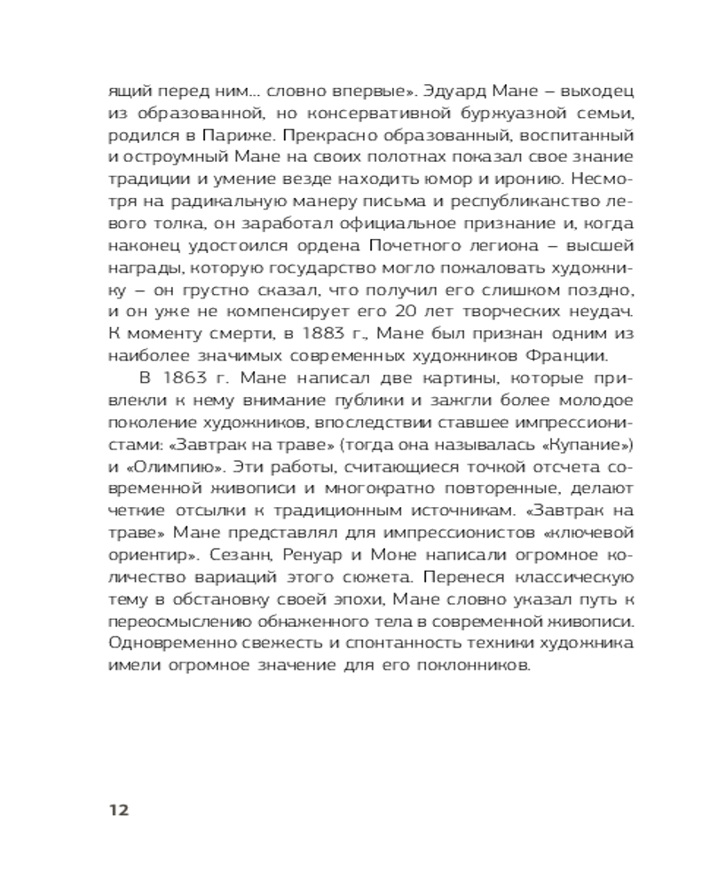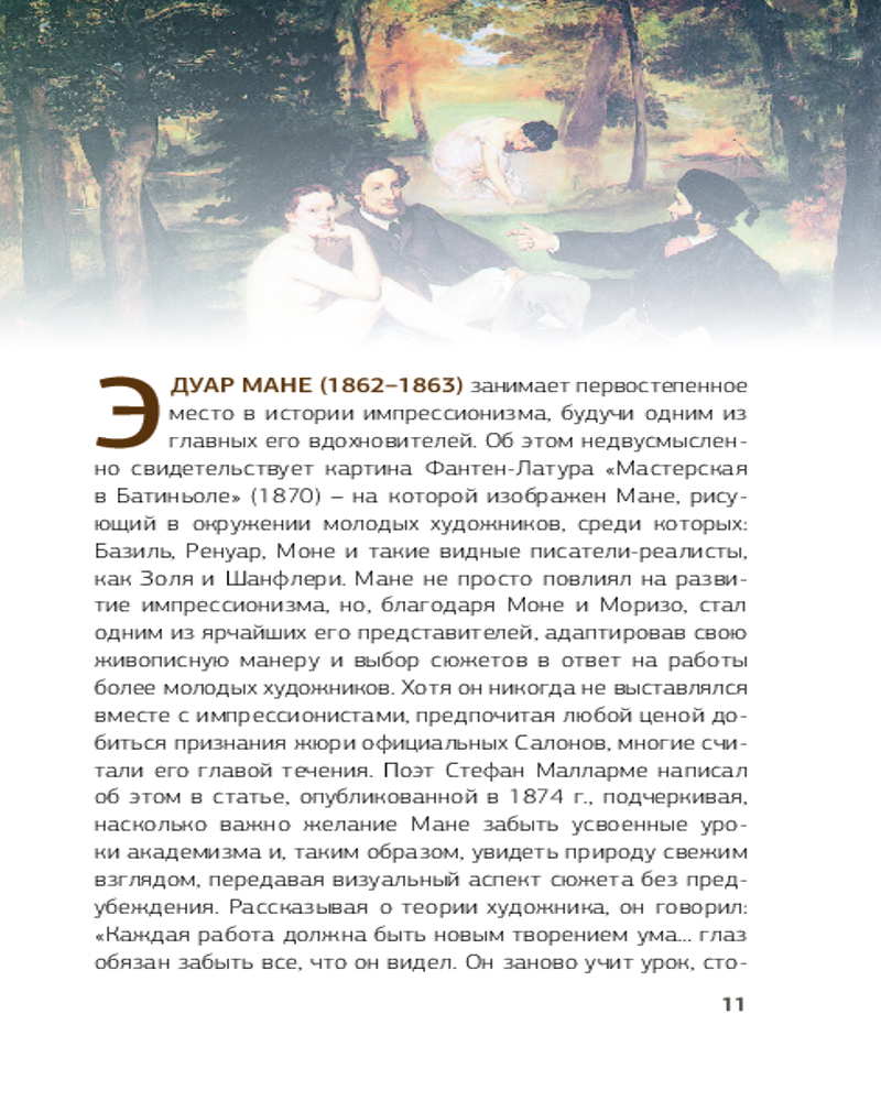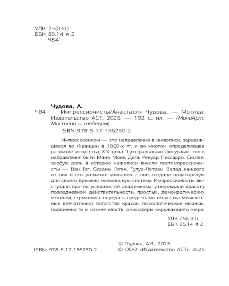 💳 Оплатить за товар можно при получении 🇰🇿 Есть бесплатная доставка по Казахстану от 1 дня 🎁 Копите бонусы с каждой покупки Серия: МиниАрт. Мастера и шедевры Импрессионисты Эдуар Мане, Клод Моне, Пьер-Огюст Ренуар, Эдгар Дега, Альфред Сислей, Камиль Писсарро, Берта Моризо, Мэри Кассат... Когда мы смотрим на полотна этих художников, нас снова и снова берут в плен мягкая поэзия запечатленного мгновения и магия неповторимой свежести и чистоты красок. В живописи импрессионистов даже самый банальный сюжет преображается всепоглощающим подвижным солнечным светом, вносящим в картину ощущение счастья и радости жизни. |
