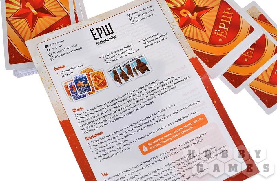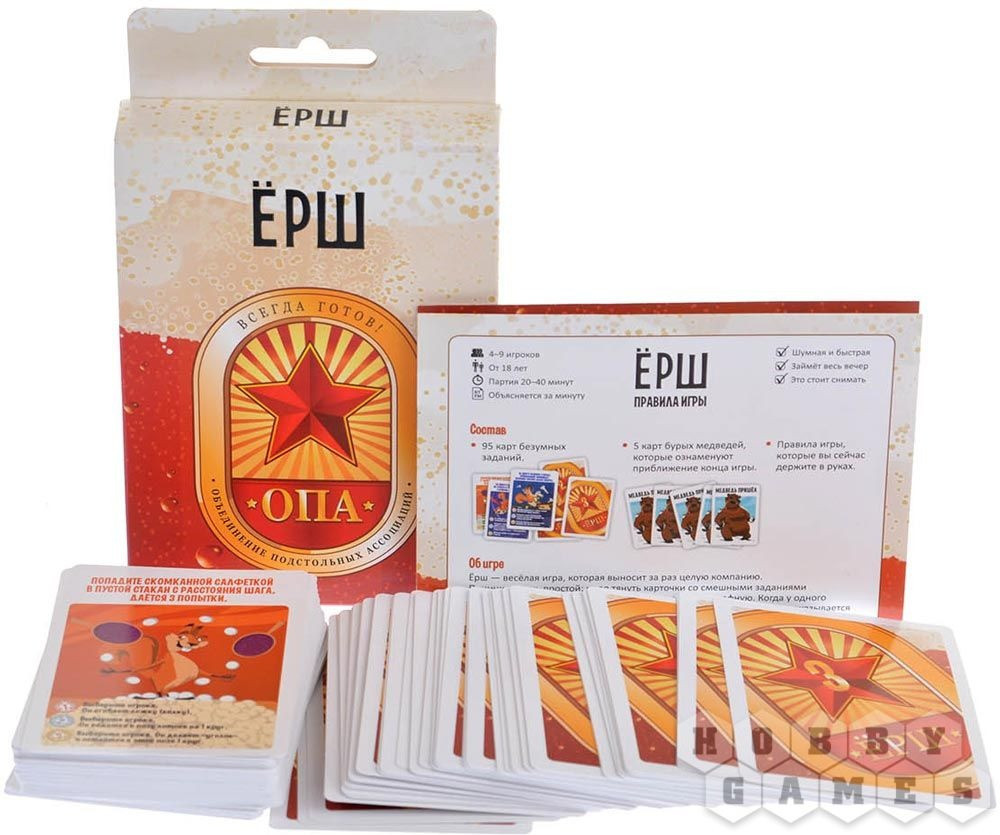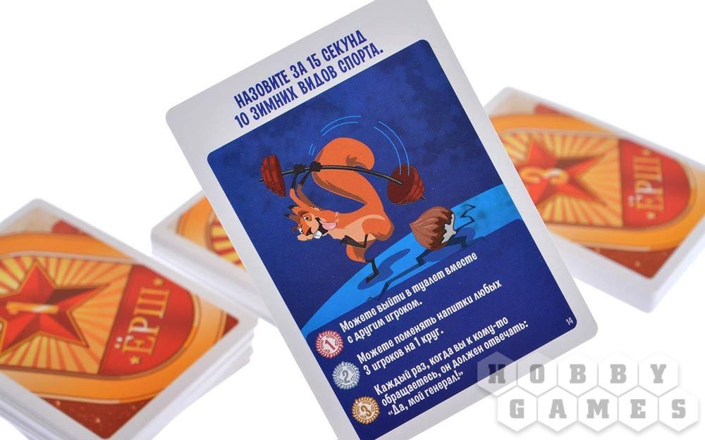В данный момент этот товар отсутствует в продаже. Возможно, у нас найдется аналогичный или похожий товар здесь. Вечеринки и спорт ещё как совместимы! Вот же они, уместились в коробке нового Ерша. Правила те же: тянете карточку и выполняете задание. Не можете — пьёте. При виде медведя прячетесь под стол. Главное отличие от других Ершей: большинство заданий тут про спорт, ловкость и особые умения. Пусть все оценят, как вы попадаете виноградиной за шиворот с первого раза и виртуозно достаёте языком до носа!