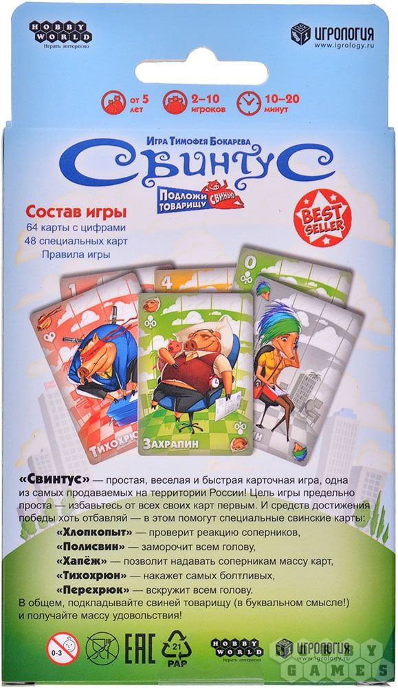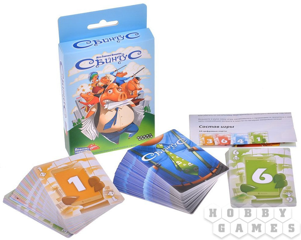 Специальные карты составляют одну из главных изюминок игры. Другая же заключается в нескольких «острых» правилах: правиле Свинтуса, перехвата и перевода карт! Вместе они подарят вам незабываемые впечатления от этой игры. Испытайте чистую свинячью радость! Кто первым избавится от всех карт с руки, тот и становится победителем!