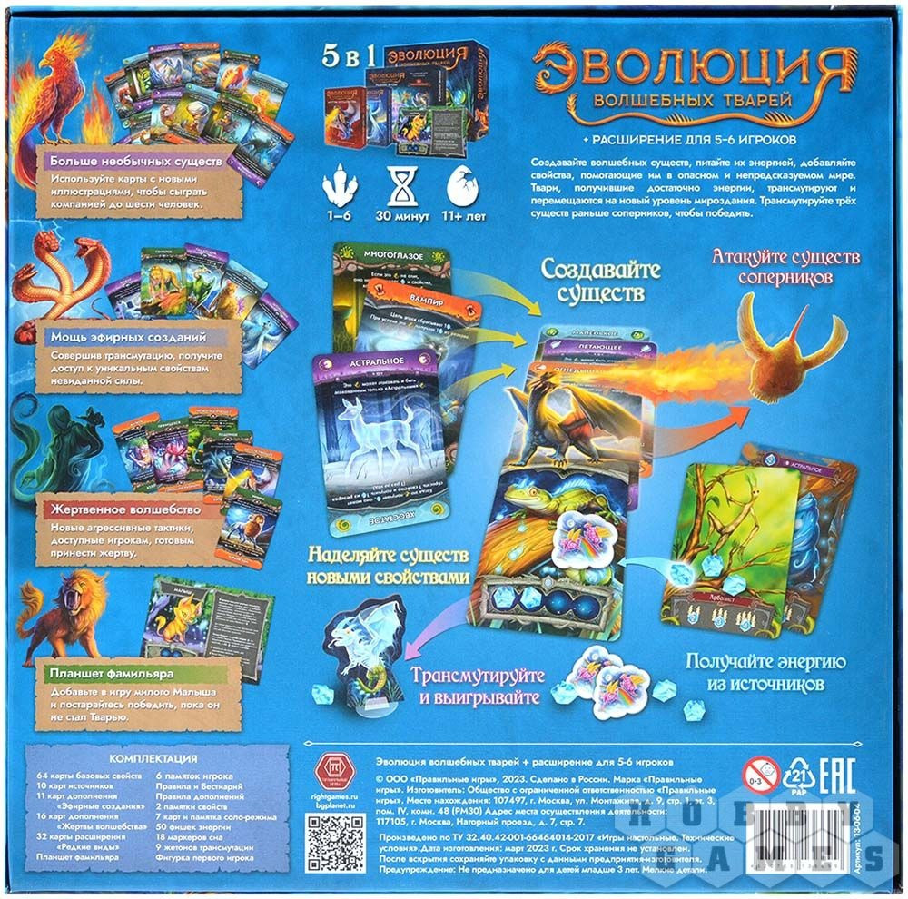 В состав входит 16 карт с 8 новыми свойствами в разных комбинациях. При подготовке к партии замешайте эти карты в колоду свойств. В «Жертвах волшебства» есть 4 новых агрессивных свойства (с плашкой оранжевого цвета). Когда существо применяет любое из них, в первую очередь необходимо принести Жертву — сбросить другое свойство этого существа. Взамен вы получаете возможность атаковать второй раз за ход. Редкие виды — расширение для 5-6 игроков В него входят 32 карты свойств базовой «Эволюции волшебных тварей» с новыми иллюстрациями животных. Просто добавьте эти карты в колоду свойств. При игре в 5-6 человек изменяется условие победы — необходимо трансмутировать всего лишь 2 своих существа. Но при возросшей конкуренции сделать это будет непросто.