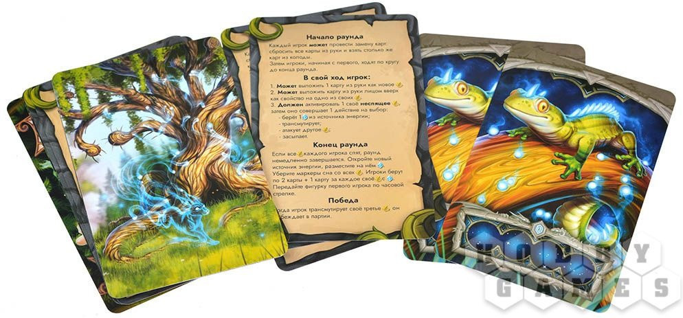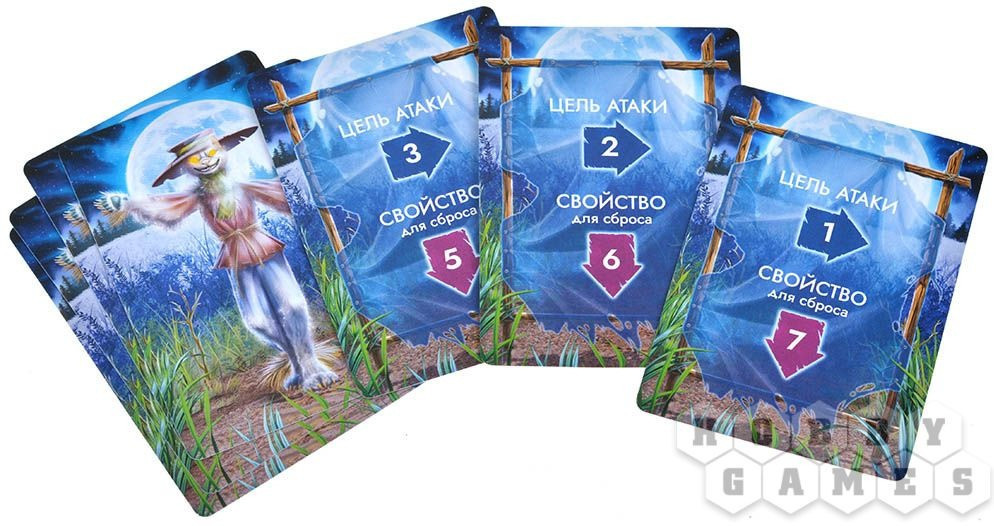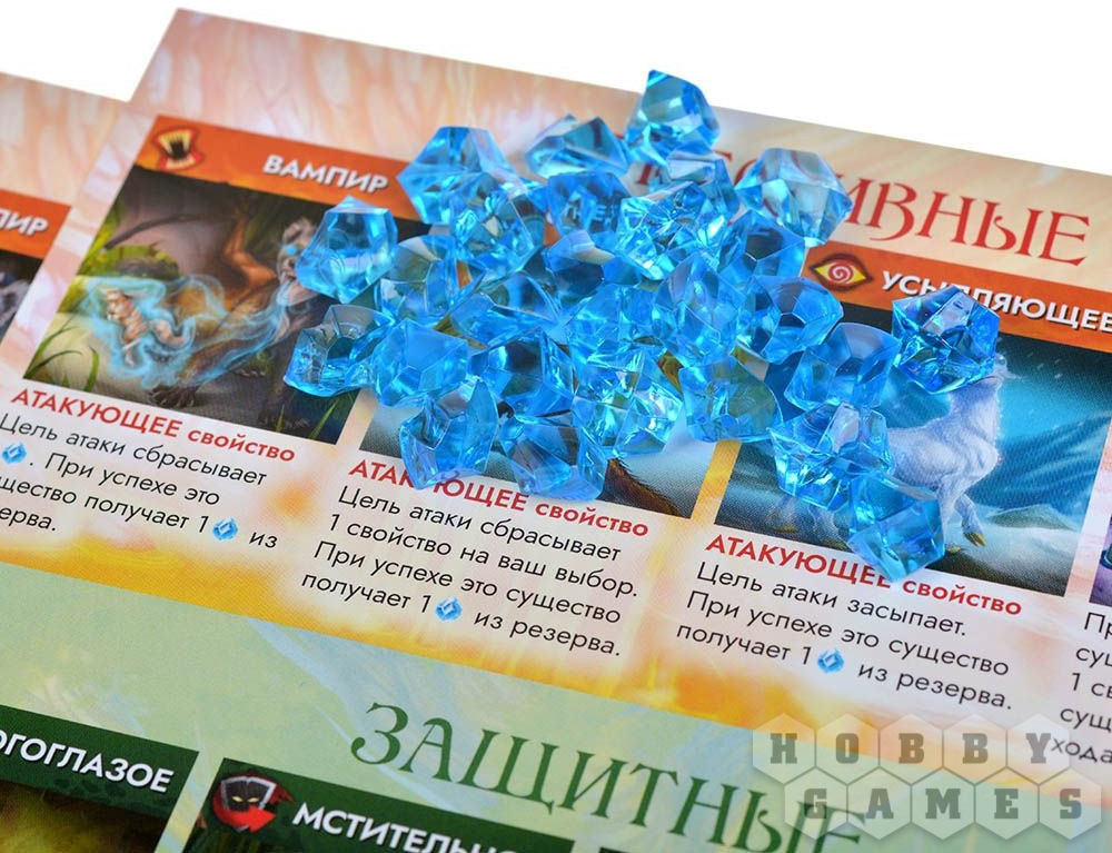Думаете, это все? Конечно, нет! В подарочном наборе притаился фамильяр. Безобидный Малыш способный превратиться в жуткую Тварь. Малыш выходит на поле как отдельный игрок, но при подсчете кристаллов энергии не учитывается. В начале раунда он открывает одну карту с верха колоды в поисках защитного или специального свойства. Если он его находит, то все прочие открытые карты кладутся под низ колоды, а Малыш получает 1 кристалл энергии и засыпает.