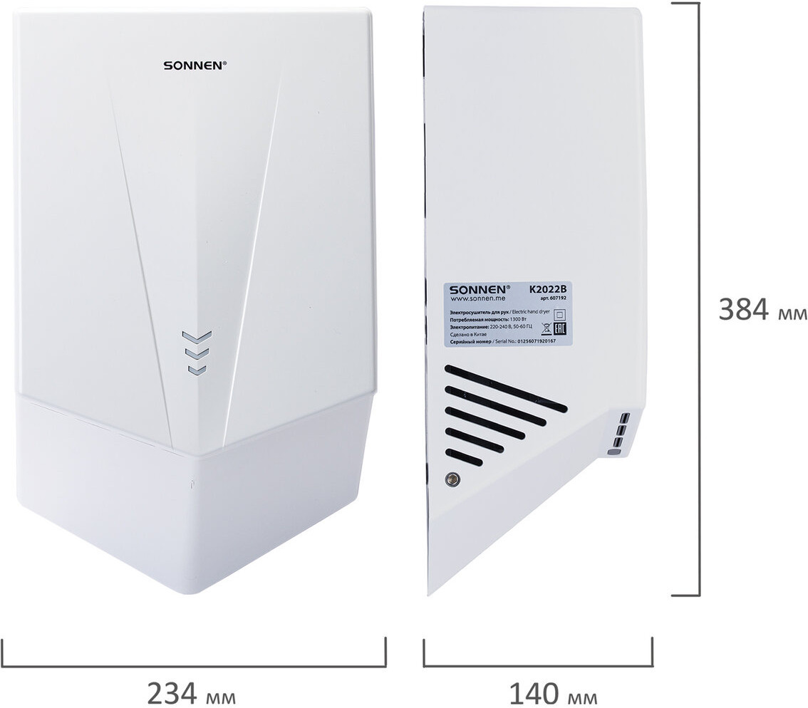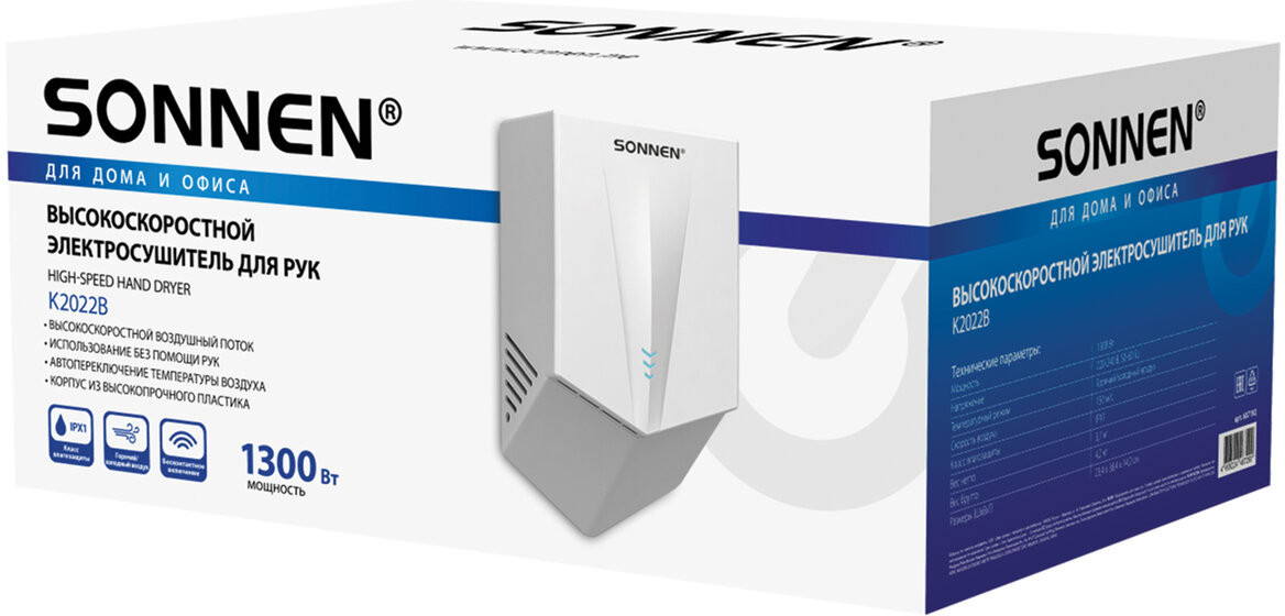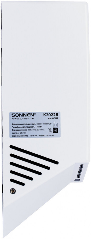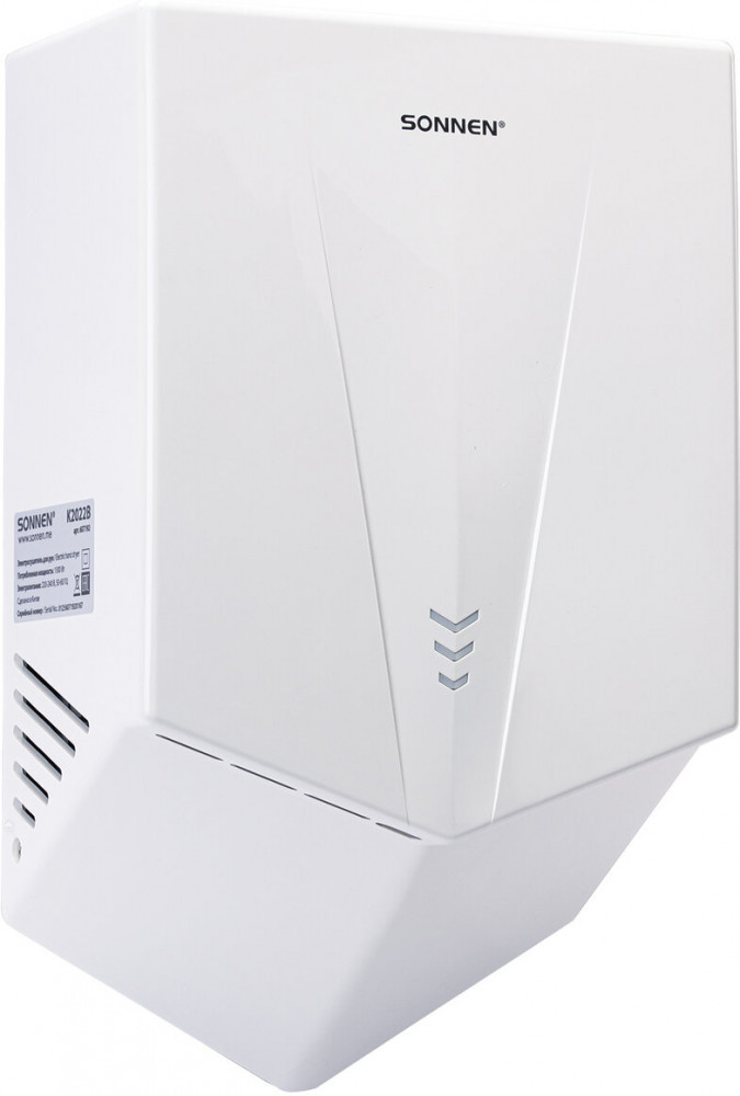 Эргономичный дизайн и надежная конструкция делают электросушилку Sonnen K2022B идеальным вариантом для мест с невысокой проходимостью. Мощность 1300 Вт обеспечивает время сушки рук за 7-9 секунд. Стандарт IPX1 гарантирует защиту от брызг. Включается и выключается сушилка автоматически при помощи инфракрасного сенсора. Пластиковый корпус в белом цвете впишется в любой интерьер. В комплект входит набор для монтажа: шурупы с пластиковыми дюбелями, кронштейн и шаблон установки для удобства разметки точек крепления. Данный товар относится к среднему ценовому сегменту.