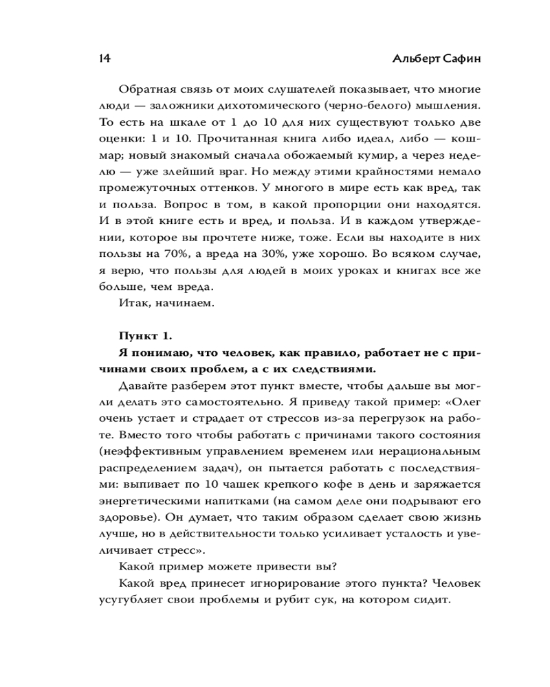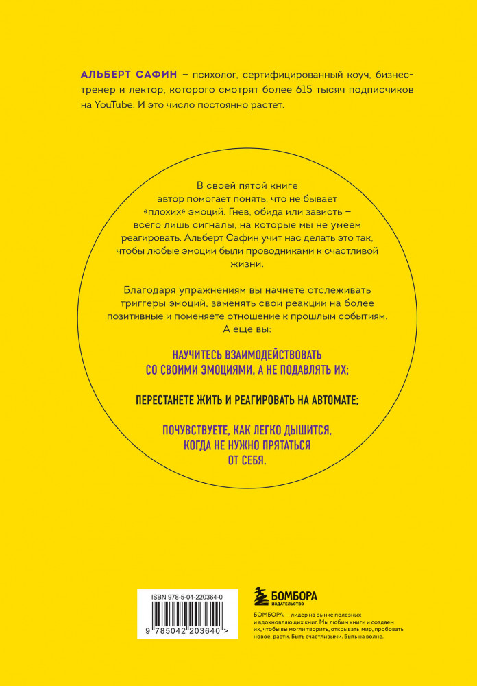 💳 Оплатить за товар можно при получении 🇰🇿 Есть бесплатная доставка по Казахстану от 1 дня 🎁 Копите бонусы с каждой покупки Серия: Воспитание разума. Книги для тех, кто хочет быть продуктивным Альберт Сафин — психолог, сертифицированный коуч, бизнес-тренер и лектор, которого смотрят более 615 тысяч подписчиков на YouTube. И это число постоянно растет. В своей пятой книге автор помогает понять, что не бывает «плохих» эмоций. Гнев, обида или зависть — всего лишь сигналы, на которые мы не умеем реагировать. Альберт Сафин учит нас делать это так, чтобы любые эмоции были проводниками к счастливой жизни. Благодаря упражнениям вы начнете отслеживать триггеры эмоций, заменять свои реакции на более позитивные и поменяете отношение к прошлым событиям. |