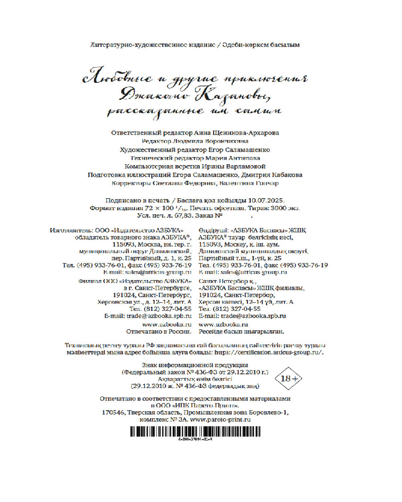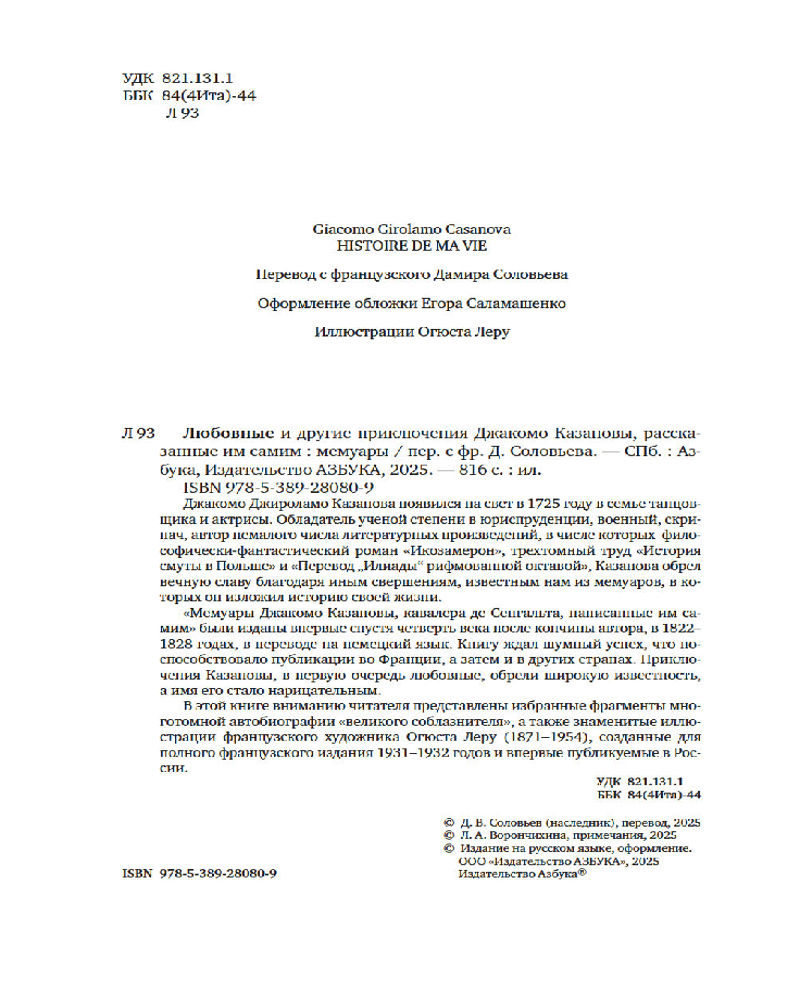 💳 Оплатить за товар можно при получении 🇰🇿 Есть бесплатная доставка по Казахстану от 1 дня 🎁 Копите бонусы с каждой покупки Серия: Больше чем книга Джакомо Джироламо Казанова появился на свет в 1725 году в семье танцовщика и актрисы. Обладатель ученой степени в юриспруденции, военный, скрипач, автор немалого числа литературных произведений, в числе которых философически-фантастический роман «Икозамерон», трехтомный труд «История смуты в Польше» и «Перевод «Илиады» рифмованной октавой», Казанова обрел вечную славу благодаря иным свершениям, известным нам из мемуаров, в которых он изложил историю своей жизни. |