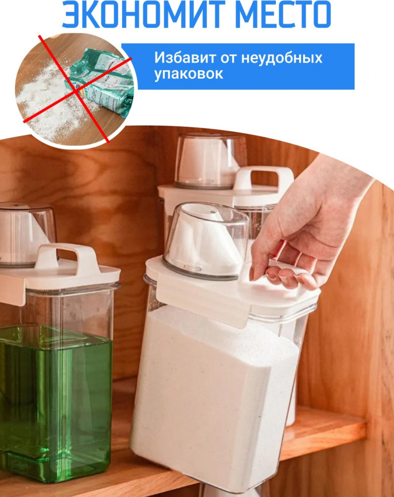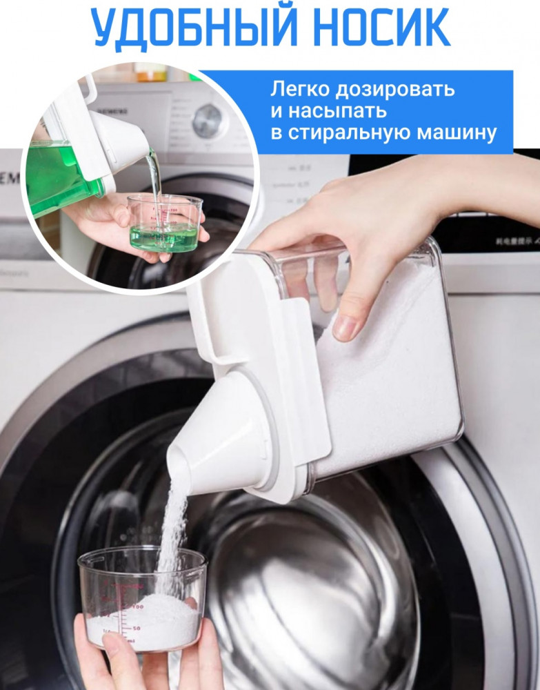 Он станет отличной заменой мешкам под порошок. С обычными мешками засыпать моющее средство в стиральную машинку — целая проблема. Все постоянно просыпается, да и держать тяжелую упаковку не совсем удобно. Пластиковый контейнер же имеет специальный носик — с его помощью порошок аккуратно пересыпается в отсек. А ручка позволяет брать емкость одной рукой.