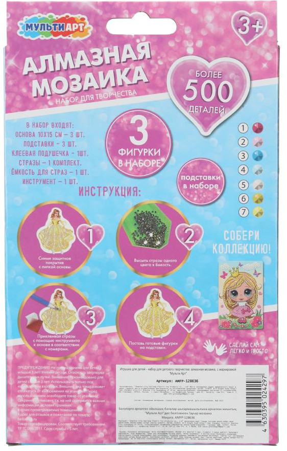 Серия: Принцессы Набор для детского творчества — фигурная кристальная мозаика на подставке «Принцессы» ТМ «Мульти Арт» — отличный подарок для ребёнка, который будет способствовать развитию его творческих способностей. При помощи этого набора юные творцы смогут создать красивые поделки в виде очаровательных сказочных принцесс, декорированные сверкающими стразами. Блестящие фигурки устанавливаются на специальные подставки, их можно подарить близким или использовать для украшения комнаты. Творческие занятия с алмазной мозаикой ТМ «Мульти Арт» обладают успокаивающим действием, а также развивают: творческое мышление, цветовое восприятие, усидчивость, внимание и аккуратность. |