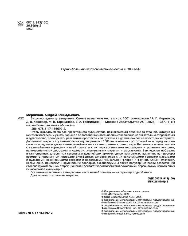💳 Оплатить за товар можно при получении 🇰🇿 Есть бесплатная доставка по Казахстану 🎁 Копите бонусы с каждой покупки Серия: Большая книга обо всём Чтобы выбрать место для предстоящего путешествия, познакомиться поближе со страной, которую вы мечтаете посетить, и узнать больше о ее достопримечательностях, совершенно не обязательно отправляться в турагенство, приобретать рекламные проспекты или пускаться в долгие поиски на просторах интернета. Достаточно открыть эту энциклопедию-путеводитель с 1000 эксклюзивных фотографий — и перед вашими глазами предстанут десятки интереснейших мест в самых разных странах мира. Вы сможете познакомиться с величайшими городами нашей планеты, с их торжественными площадями и уютными улицами, величественными дворцами и храмами, знаменитыми музеями и выставками. |