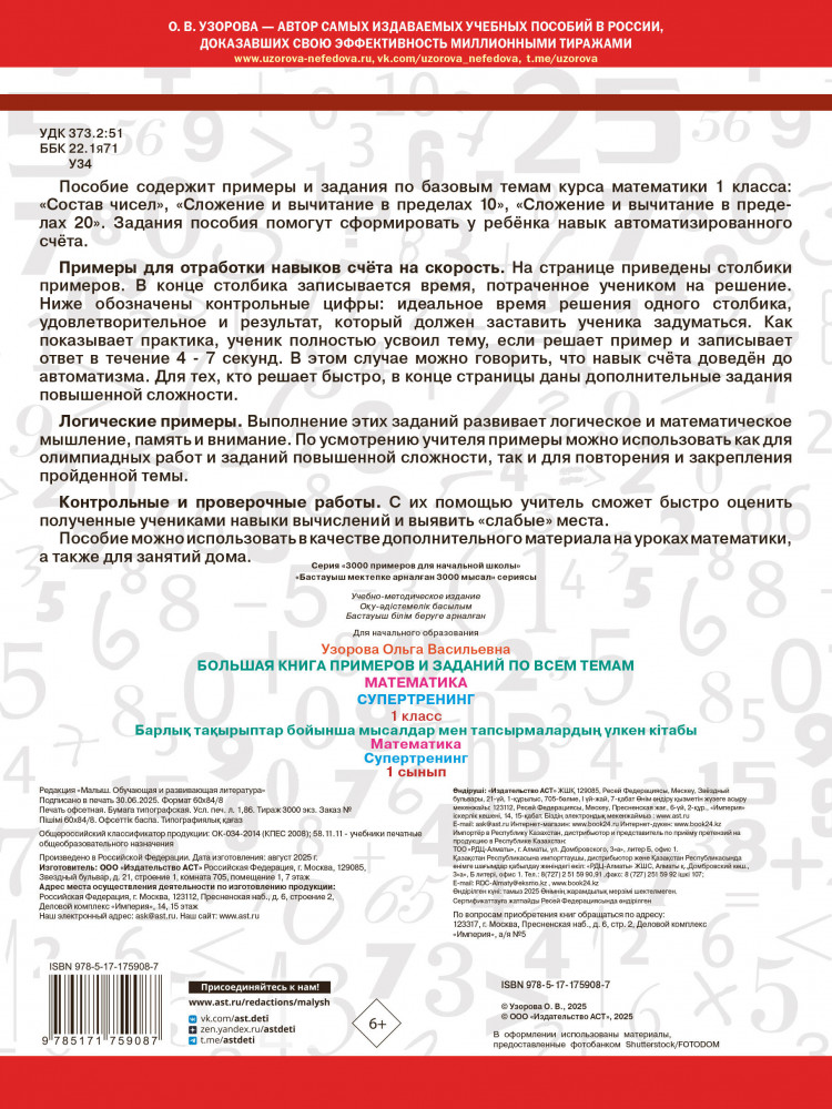 💳 Оплатить за товар можно при получении 🇰🇿 Есть бесплатная доставка по Казахстану от 1 дня 🎁 Копите бонусы с каждой покупки Серия: 3000 примеров для начальной школы Пособие содержит примеры и задания по базовым темам курса математики 1 класса: «Состав чисел», «Сложение и вычитание в пределах 10», «Сложение и вычитание в пределах 20». Задания пособия помогут сформировать у ребёнка навык автоматизированного счёта. |