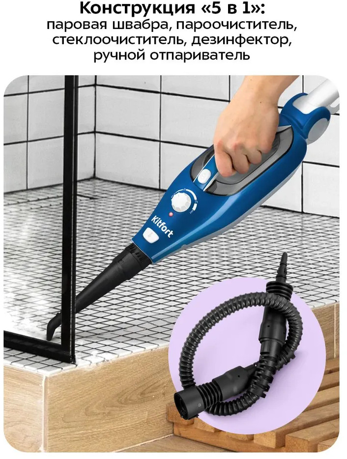 Паровая швабра Kitfort КТ-1005 может заменить 5 различных устройств. Паровую швабру можно также использовать как ручной отпариватель для одежды, стеклоочиститель, пароочиститель и дезинфектор за счет высокой температуры пара. При отсоединении ручки, швабра превращается в ручной пароочиститель. В комплекте 7 насадок. Можно чистить паром различные поверхности: кафель и швы между плитками, сантехнику, духовки, плиты, СВЧ-печи, жировые отложения, стёкла, полы, отпаривать вещи.