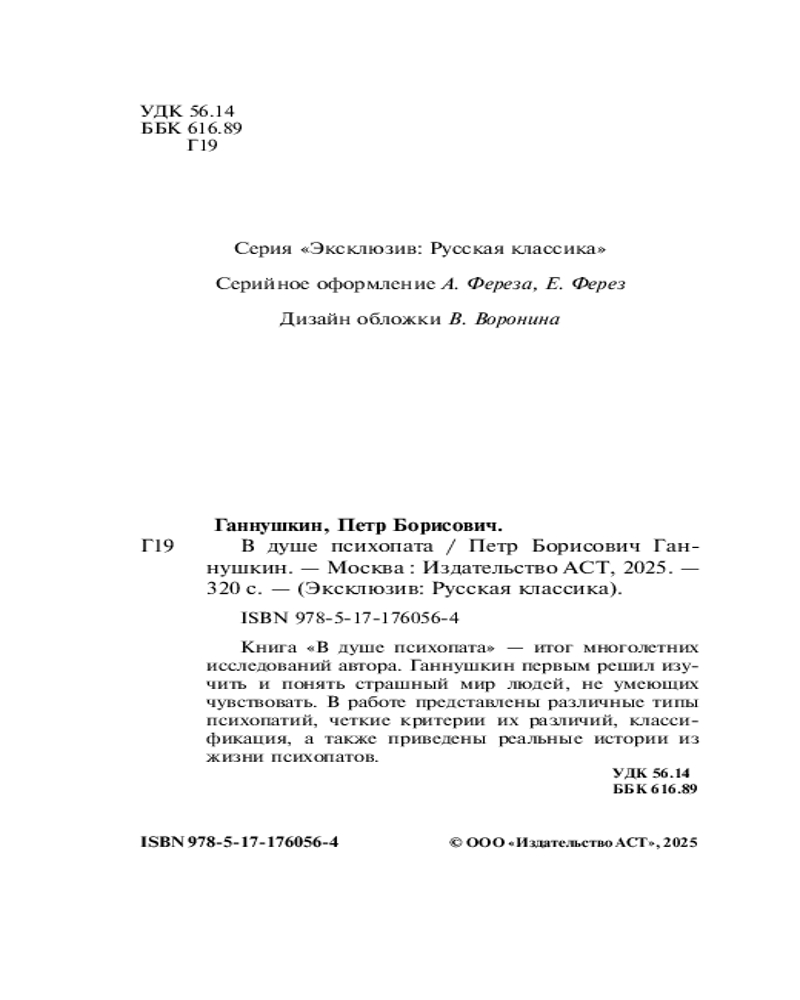 💳 Оплатить за товар можно при получении 🇰🇿 Есть бесплатная доставка по Казахстану от 1 дня 🎁 Копите бонусы с каждой покупки Серия: Эксклюзив: Русская классика Книга «В душе психопата» — итог многолетних исследований автора. Ганнушкин первым решил изучить и понять страшный мир людей, не умеющих чувствовать. В работе представлены различные типы психопатий, четкие критерии их различий, классификация, а также приведены реальные истории из жизни психопатов. |