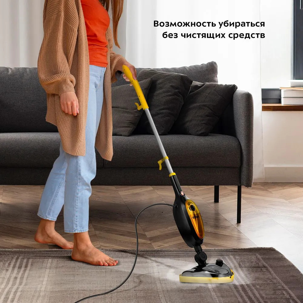 Принцип действия паровой швабры основан на воздействии горячего пара на загрязнения. Пар проникает внутрь загрязнения, размягчая и растворяя его, а затем с помощью тряпки частички грязи смываются. Высокая температура пара способствует процессу очистки. Устройство обладает большим углом наклона при уборке, который поможет легко убирать пространство под мебелью. Напольная насадка закреплена на специальном шаровом шарнире с наклоном в двух плоскостях, что делает швабру очень манёвренной и облегчает уборку.
