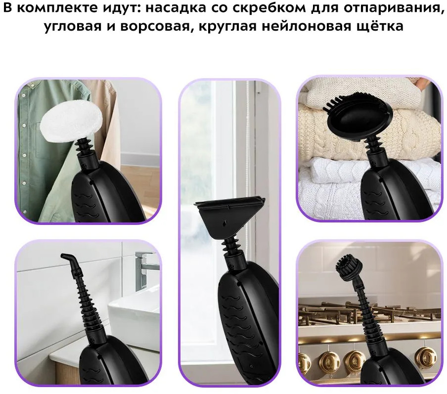 При помощи специальных насадок из комплекта КТ-1067 вы можете очистить напольные покрытия, раковину и плиту на кухне, зеркала, окна и плитку в ванной без каких-либо химических средств, исключительно паром. Плоская нейлоновая щётка удобна для уборки радиаторных батарей и решётчатых поверхностей, а струйная для чистки щелей и углов. Скребок подойдёт для очистки окон, зеркал и кафельной плитки. Латунная щётка поможет справиться со стойкими загрязнениями.