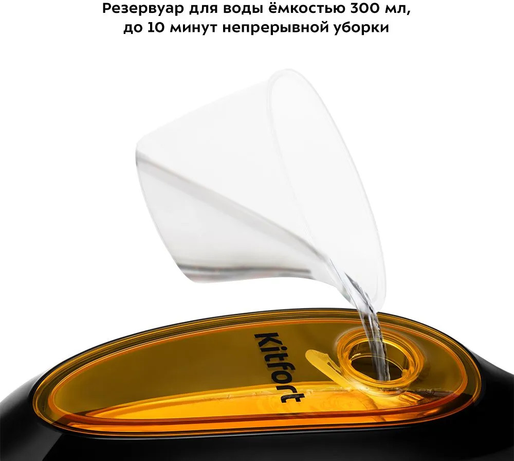Устройство оснащено резервуаром для воды ёмкостью 300 мл, что позволяет производить непрерывную уборку 8-10 минут. Для удобного наливания воды в комплекте предусмотрен мерный стакан. В комплекте предусмотрено множество насадок для различного использования. Также к паровой швабре будут идти мерный стакан, воронка, тряпки для пола и рамка для ковра.