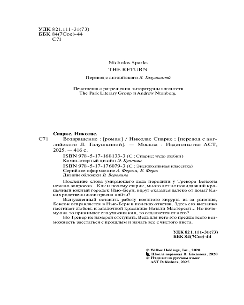 💳 Оплатить за товар можно при получении 🇰🇿 Есть бесплатная доставка по Казахстану от 1 дня 🎁 Копите бонусы с каждой покупки Серия: Эксклюзивная классика Последние слова умирающего деда породили у Тревора Бенсона немало вопросов... Как и почему старик, много лет не покидавший крошечный южный городок Нью-Берн, вдруг оказался далеко от дома? Каких родственников просил найти? Вынужденный оставить работу военного хирурга из-за ранения, Бенсон отправляется в Нью-Берн в поисках ответов. Здесь его внезапно настигает любовь к загадочной красавице Натали Мастерсон... Но почему она то принимает его ухаживания, то отдаляется от него? Но Тревор не намерен отступать. Ведь для него — это прежде всего возможность расстаться с прошлым и начать все с чистого листа. |