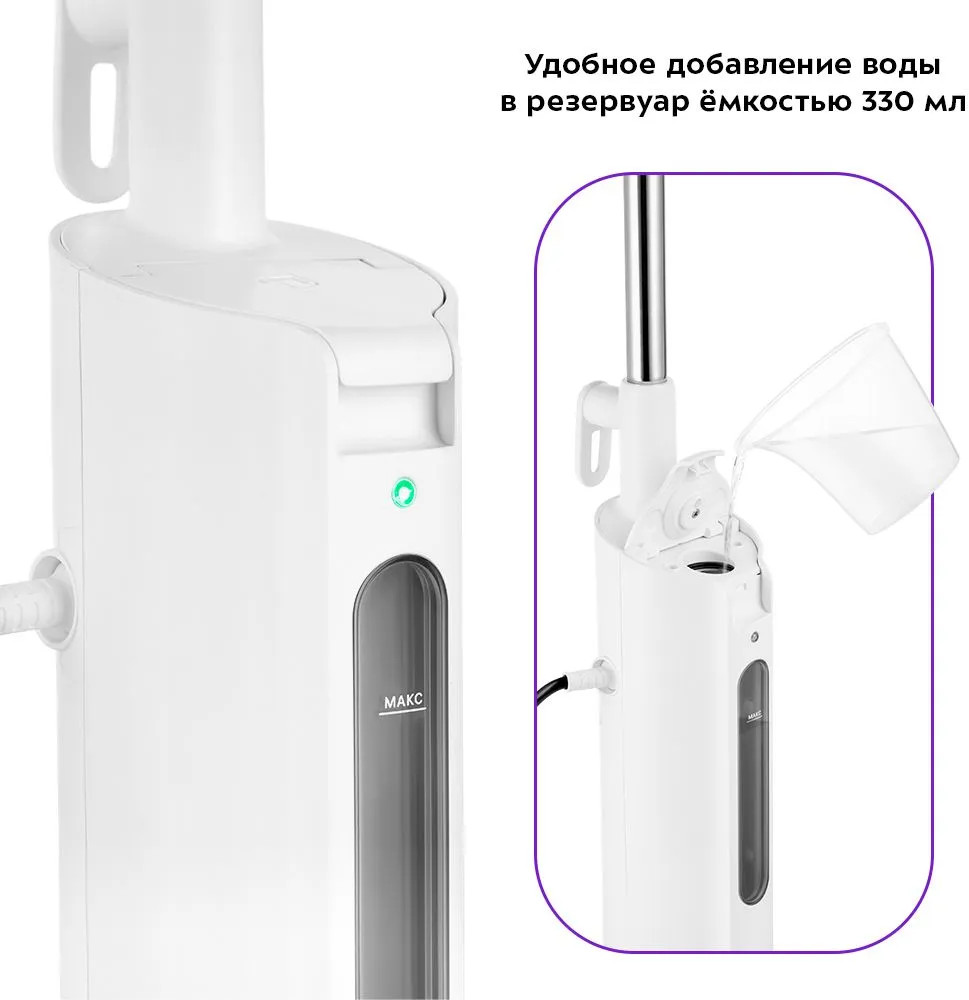 Паровая швабра имеет большой угол наклона при уборке. Напольная щётка закреплена на специальном шаровом шарнире с наклоном в 2 плоскостях, что делает швабру КТ-1052 очень манёвренной и значительно облегчает уборку. Резервуар для воды имеет ёмкость 330 мл. Такого объёма хватает примерно на 16 мин уборки. Мерным стаканчиком удобно заливать воду в резервуар. Мигание индикатора указывает на нагрев воды. Когда устройство готово к работе, индикатор горит непрерывно.