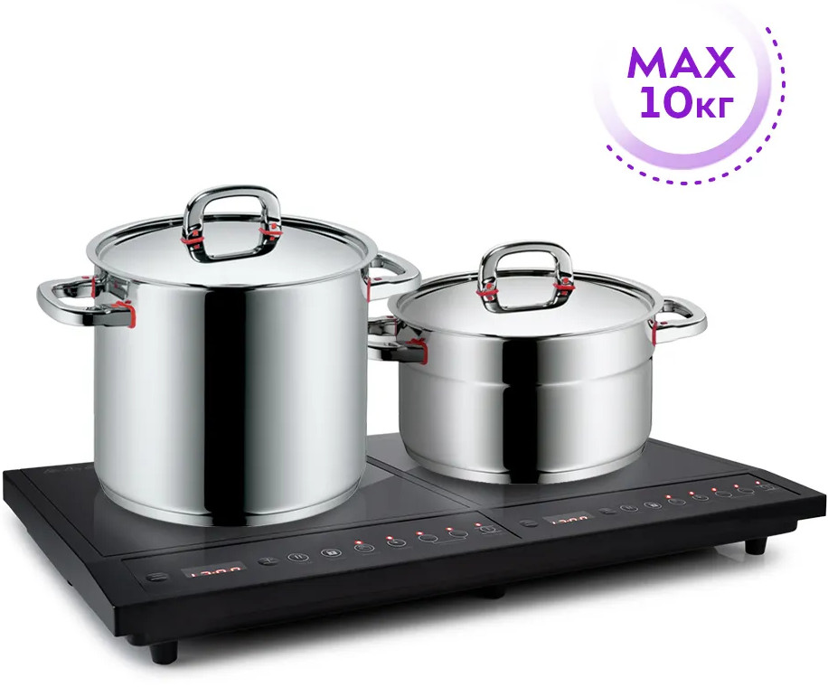 Для индукционной плиты подходит посуда с дном из ферромагнитных материалов: стальная, чугунная, эмалированная, посуда из нержавеющей стали, а также любая другая, предназначенная для индукционного нагрева. Плита суммарно выдерживает вес не более 10 кг. |