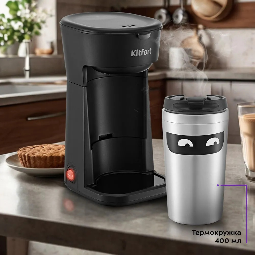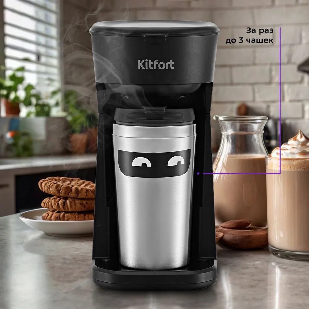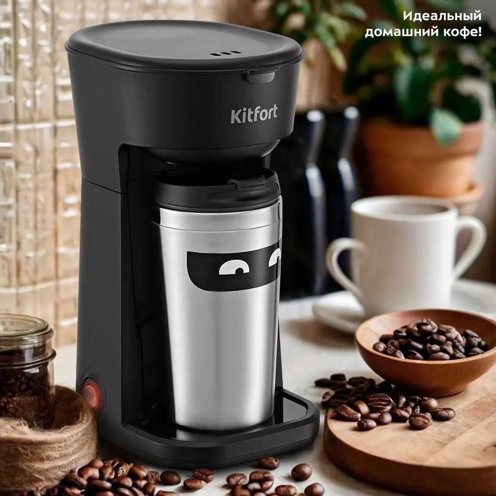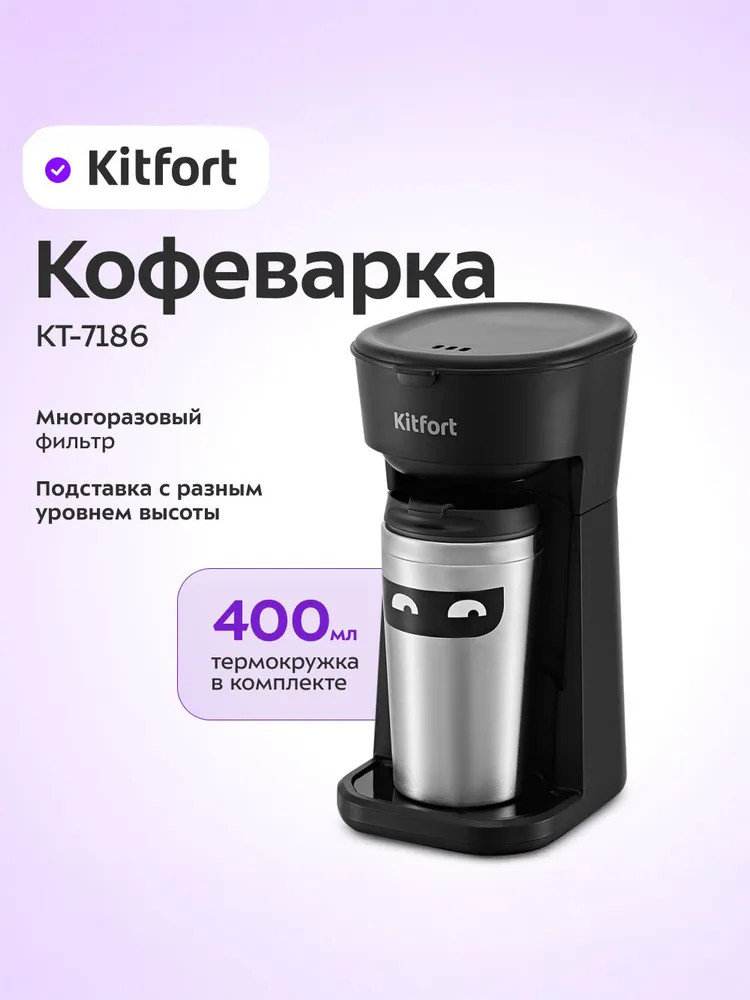 Капельная кофеварка КТ-7186 готовит ароматный черный кофе из молотого кофе одним нажатием кнопки. Компактная кофеварка экономит место на кухне и рассчитана на приготовление кофе за 1 раз на 1-3 чашки. Многоразовый фильтр вмещает 15 грамм кофе. Термокружка объёмом 400 мл выполнена из нержавеющей стали и пластика, что позволяет сохранить напиток тёплым. Отверстие для питья имеет удобную форму и закрывается крышкой, поэтому вы сможете взять кофе с собой и пить на ходу.
