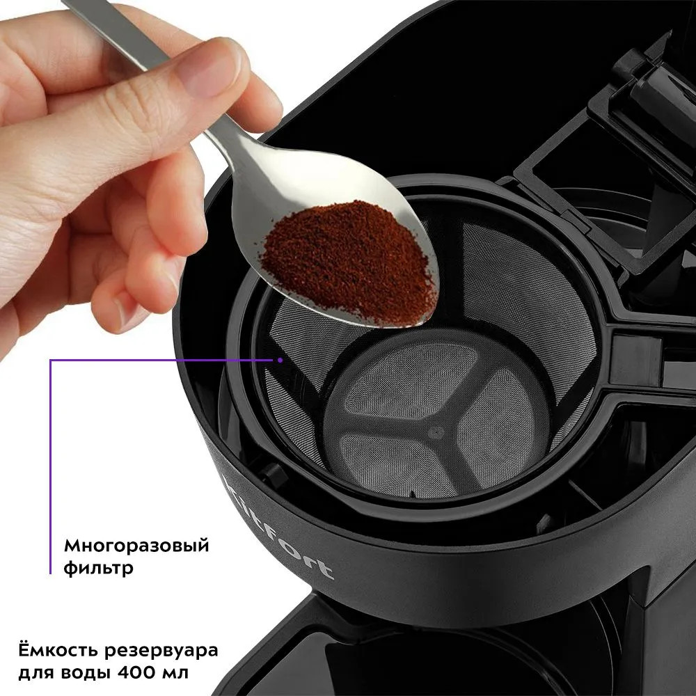Кофеварка оснащена многоразовым фильтром, которым можно пользоваться неограниченное количество раз. Пройдя через нейлоновую сетку, вода попадает в термокружку. Фильтр вмещает 15 грамм молотого кофе, а резервуар для воды имеет ёмкость 400 мл. Прибор оборудован специальной подставкой, благодаря которой вы сможете готовить кофе сразу в чашку меньшего объёма, чем кружка из комплекта. Прекрасный выбор для тех, кто любит крепкий кофе перед началом рабочего дня.
