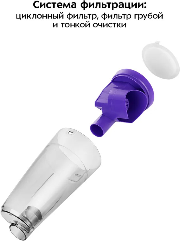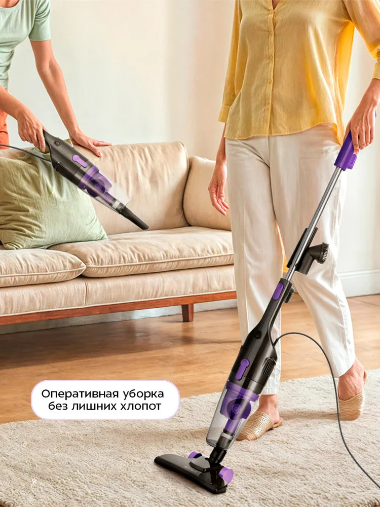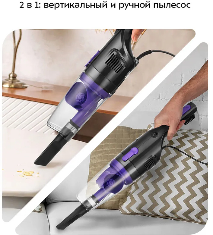 Пылесос оборудован циклонным фильтром, обеспечивающим хорошую очистку, при этом сила всасывания не зависит от наполненности пылесборника. Внутри пылесборника находится фильтр тонкой очистки и фильтр грубой очистки, которые можно вынуть и почистить. На ручке вертикального пылесоса и на самом корпусе имеются специальные держатели для удобного хранения шнура. Шнур длиной 5 м позволяет убирать на большом расстоянии от розеток.