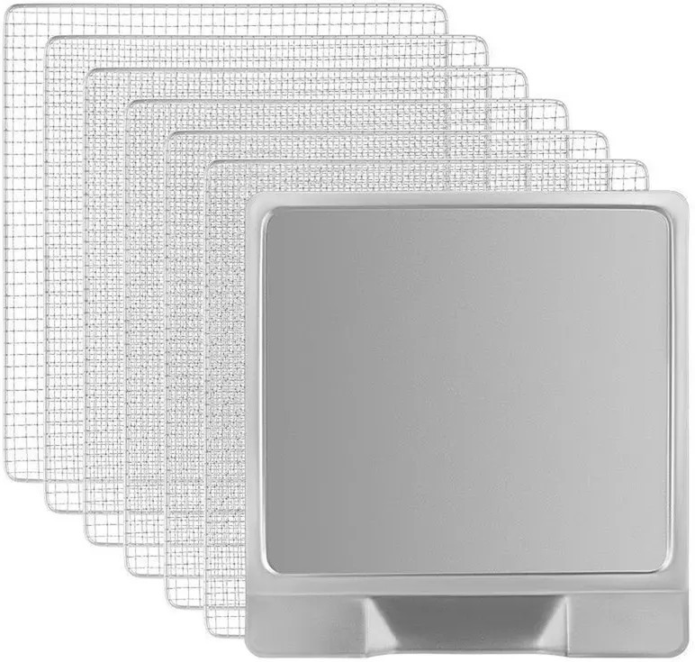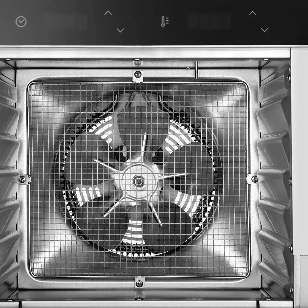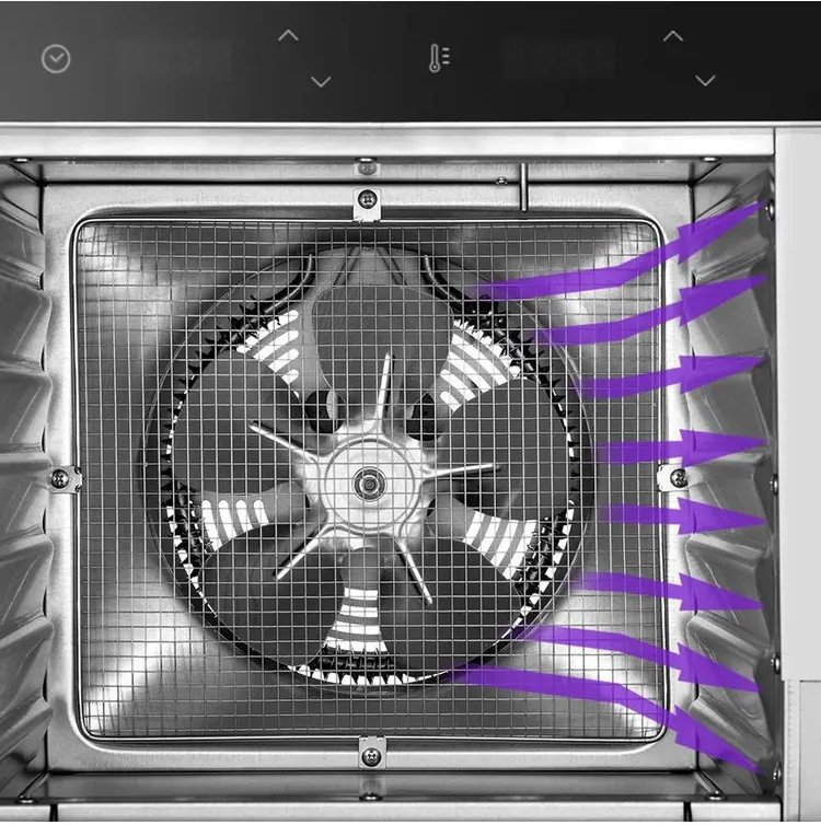 В комплекте идут 6 металлических поддонов, они подходят для большинства типов продуктов. Поддон для жидкости кладут на дно сушилки, чтобы сок и остатки от продуктов падали на него. Так дно сушилки не загрязнится, а поддон легко вытащить и помыть. В сушилке установлен мощный нагревательный элемент и вентилятор, обеспечивающий равномерное распределение нагретого воздуха по всему объёму камеры. Благодаря горизонтальному обдуву смешение запахов при сушке одновременно разных продуктов минимально.