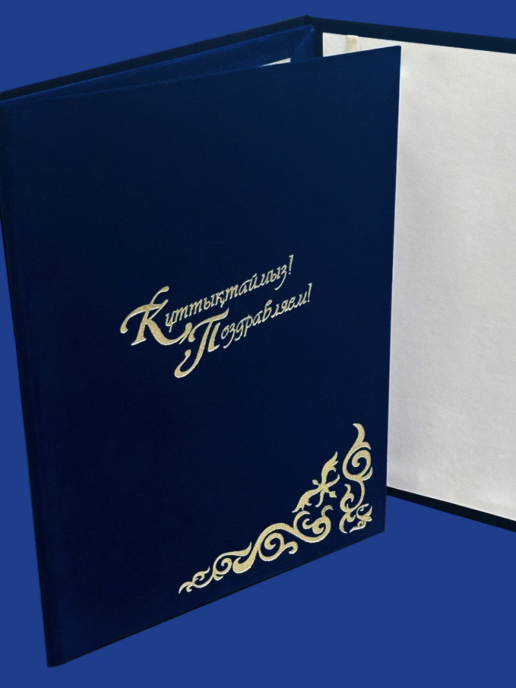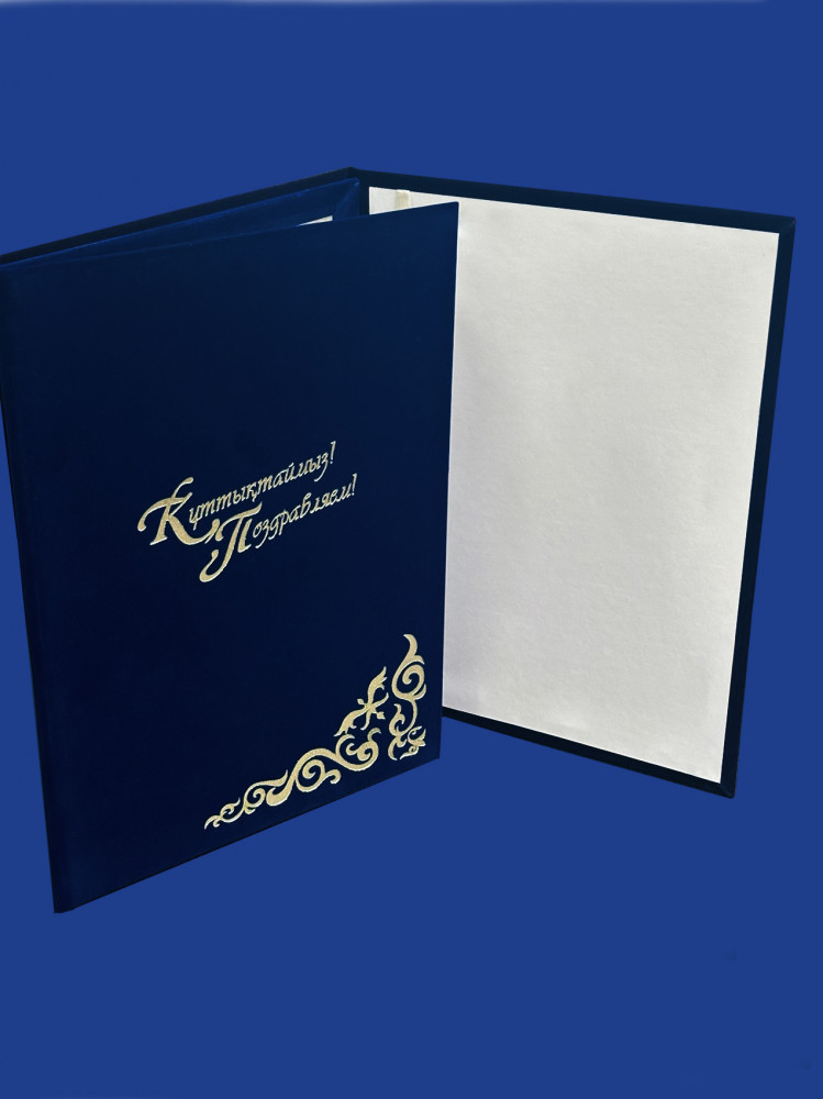Адресная папка формата А4 выполнена из переплетного картона толщиной 2.5 мм. Внешнее покрытие — материал с фактурой бархат, внутреннее — белая бумага. На лицевой стороне поздравительная надпись выполненная тиснением золотистой фольгой «Поздравляем!», цвет обложки — синий. Для крепления поздравительного адреса предусмотрено ляссе. Папка предназначена для поздравлений. |