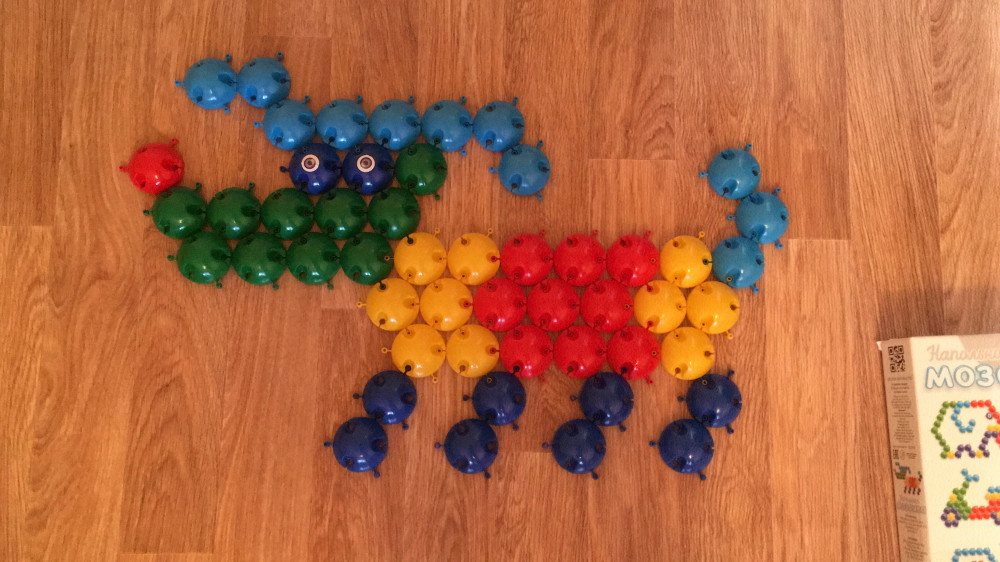 Первое впечатление положительное. Фишки достаточно крупные, диаметр соответствует указанному в описании товара. Пластины для установки фишек, как в некоторых более мелких мозаиках, нет. То есть собирать просто на полу. Смутили только крепления на фишках. Не знаю - выдержат ли они многократное присоединение и отсоединение.