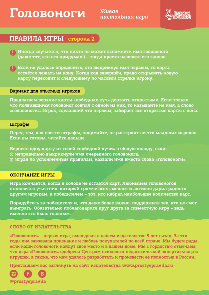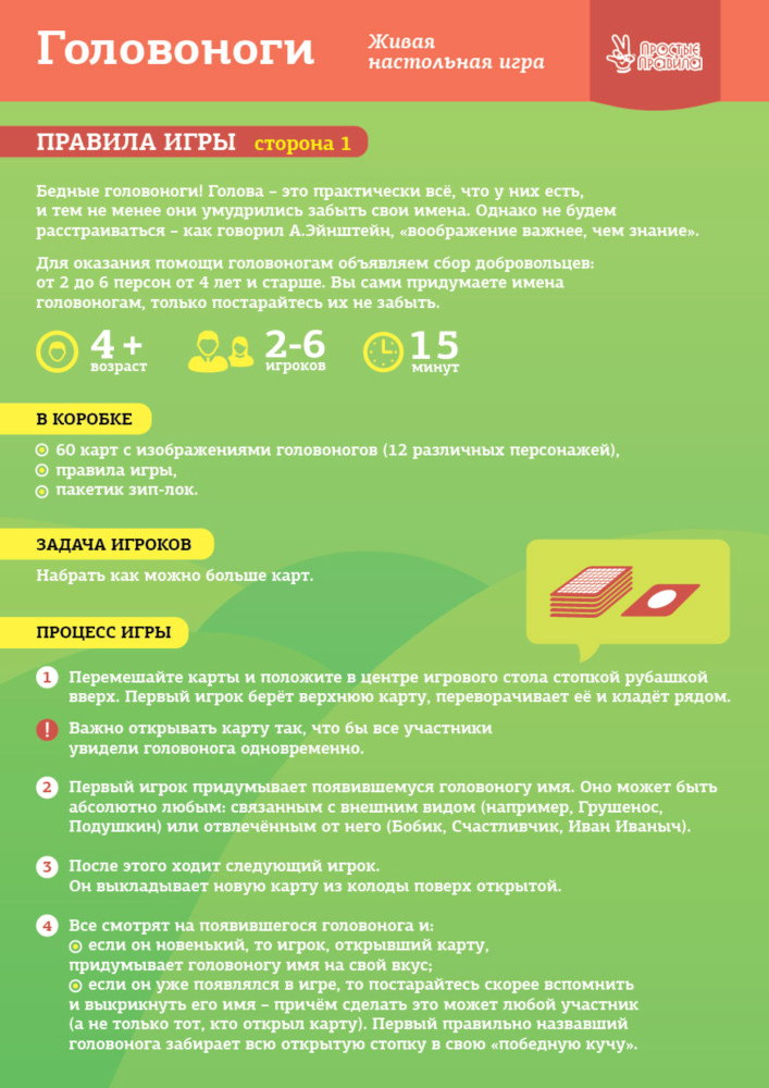 Простые правила Настольная игра «Головоноги 2»В данный момент этот товар отсутствует в продаже. Возможно, у нас найдется аналогичный или похожий товар здесь. Головоноги 2- продолжение всем полюбившейся игры головоноги. Здесь 12 новых персонажей, нарисованных той же невероятно талантливой художницей. Можно смешать обе колоды - тогда в игру сможет играть больше человек и игра станет сложнее. |