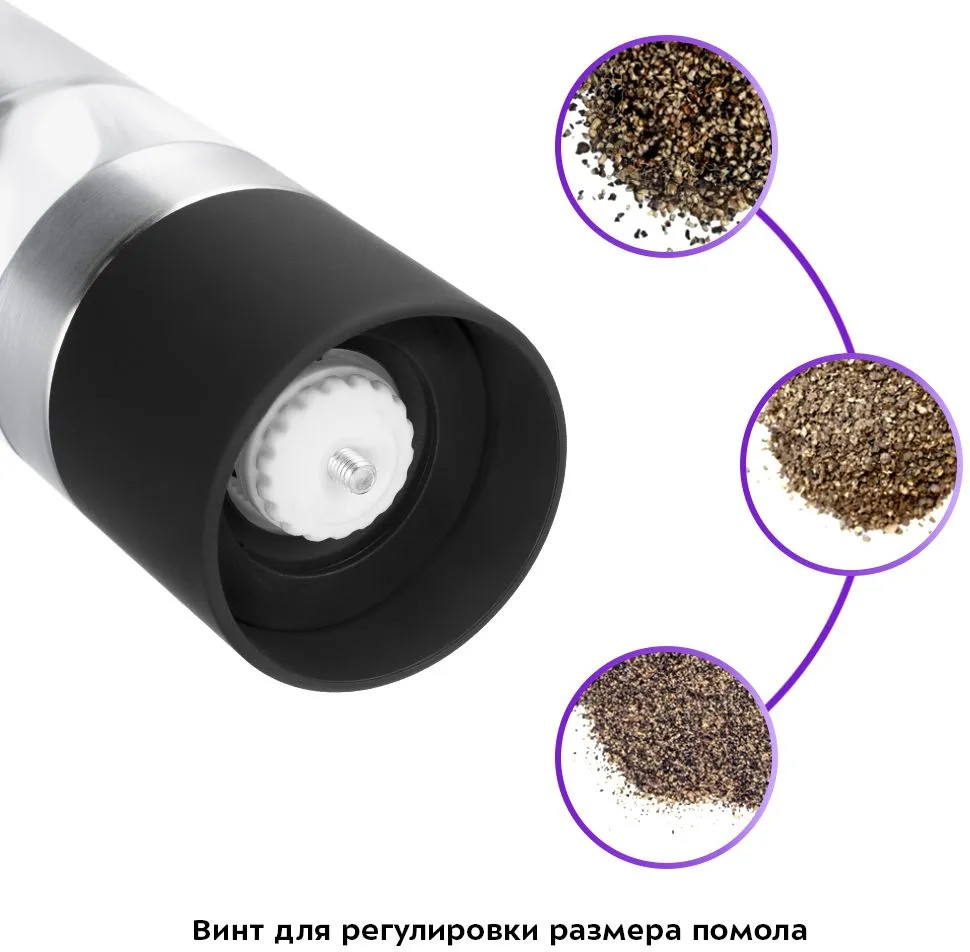 Механизм измельчения имеет винт для регулировки размера помола. Поворачивайте винт по часовой стрелке, чтобы уменьшить помол, против часовой стрелки — чтобы увеличить помол. С обеих сторон мельницы предусмотрены крышки, которые предотвратят рассыпание специй на стол. Крышки мельницы могут быть использованы как поддоны: измельчите на них необходимое количество специй, затем высыпьте, например, в кастрюлю с кипящей водой.