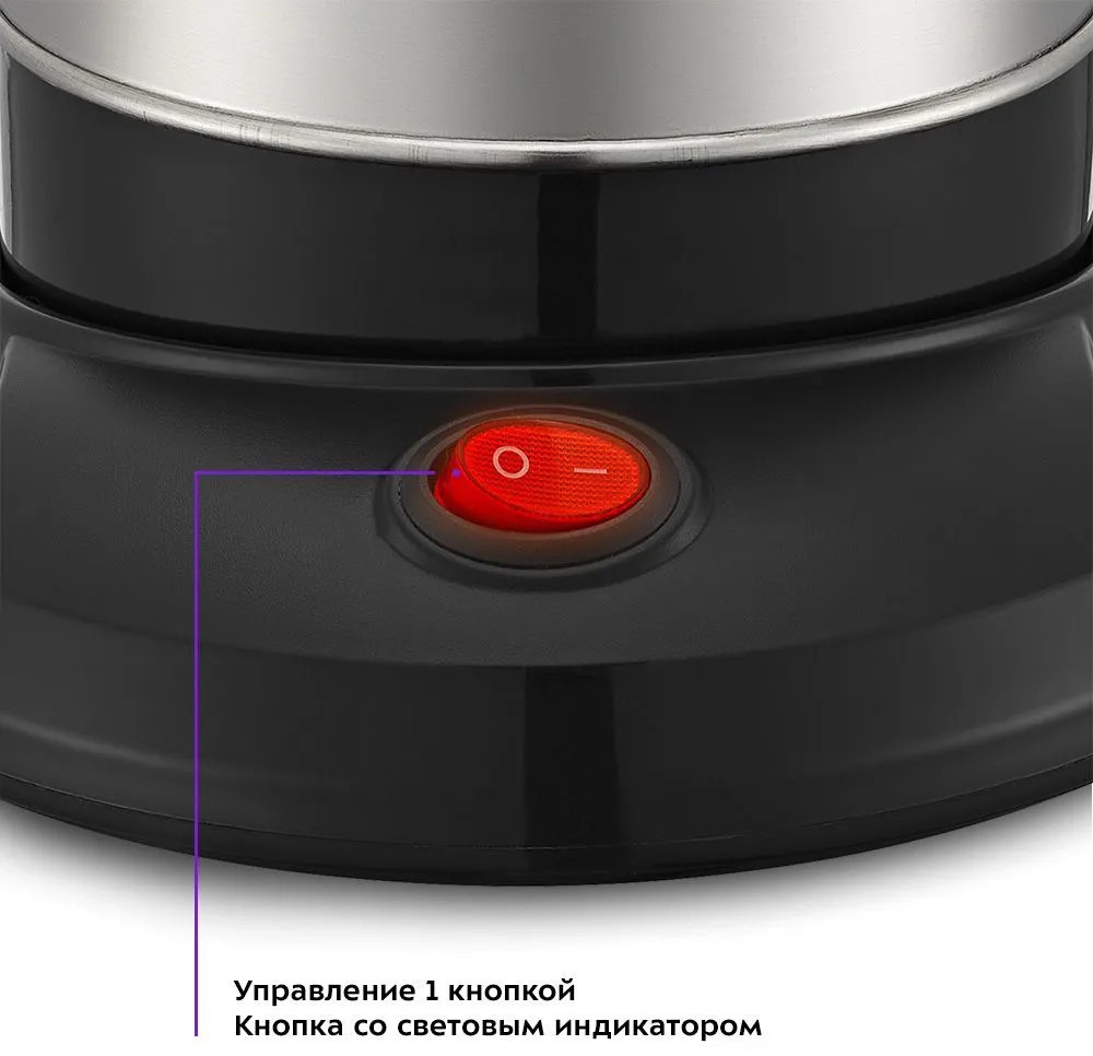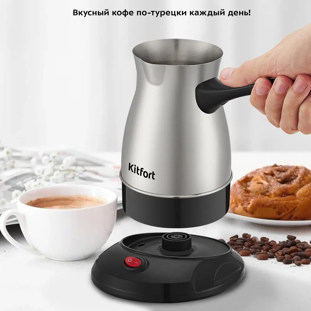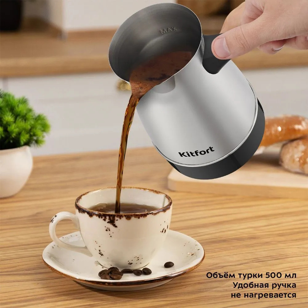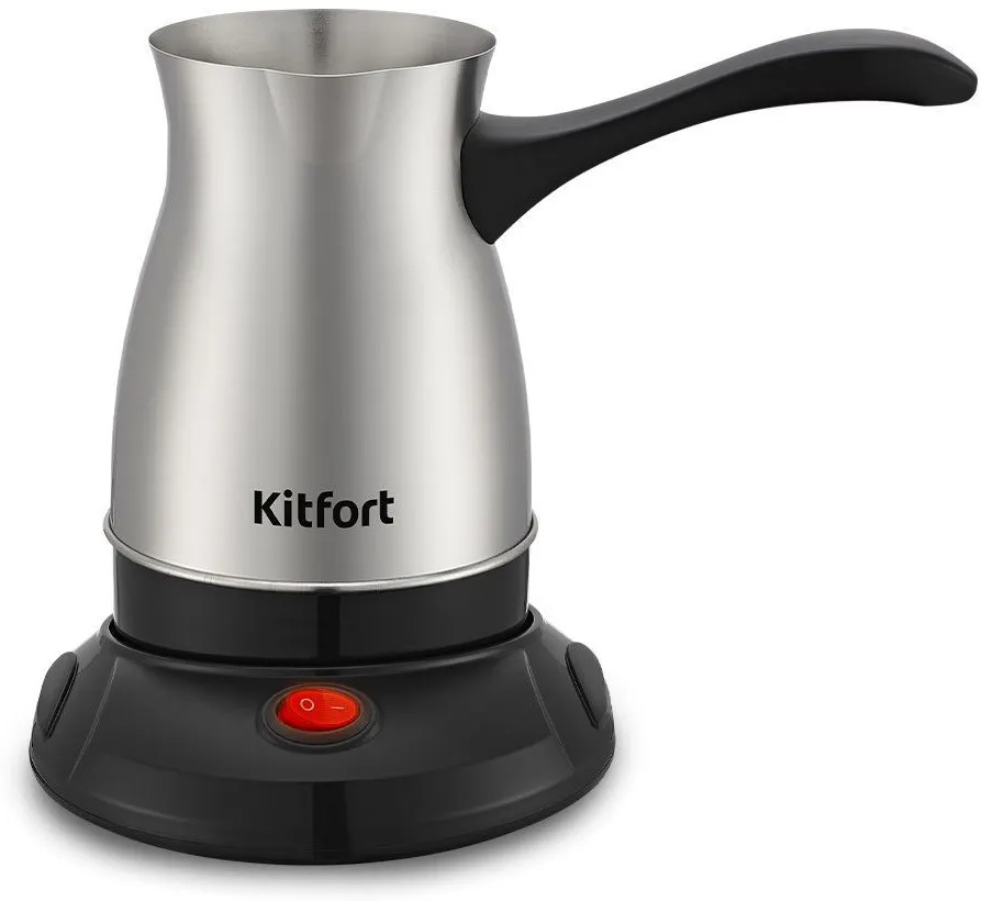 Электрическая турка КТ—7131 варит кофе по-турецки. Вы сможете быстро и легко сварить натуральный кофе на 8 чашек по 60 мл. А также подогреть молоко, приготовить какао или горячий шоколад. Ручка турки пластиковая, не нагревается и удобно лежит в руке. Кнопка на базе включает и выключает электрическую турку. Турка не отключается автоматически. У переключателя есть световой индикатор, который горит, когда база подключена к сети питания.