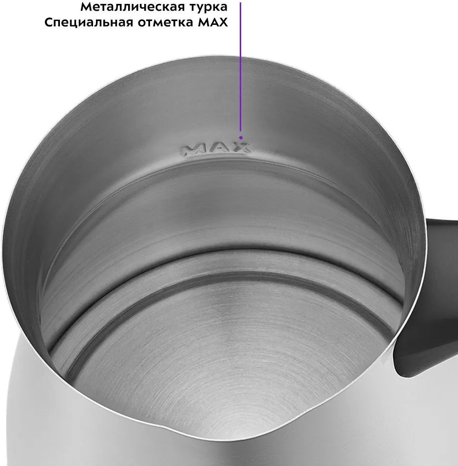 При приготовлении кофе в турке воду с натуральным кофе мелкого помола доводят до кипения, и сразу после закипания турка снимается с огня. Важно не перекипятить кофе и следить, чтобы кофе не убежало. Турку необходимо отключить вручную после поднятия пенки. Вы можете готовить меньшее количество порций в турке, необязательно заполнять ее до отметки «МАХ». Рекомендуется использовать не менее 200 мл воды. Залейте в турку воду, не превышая отметку «МАХ». Чаша турки выполнена из металла.