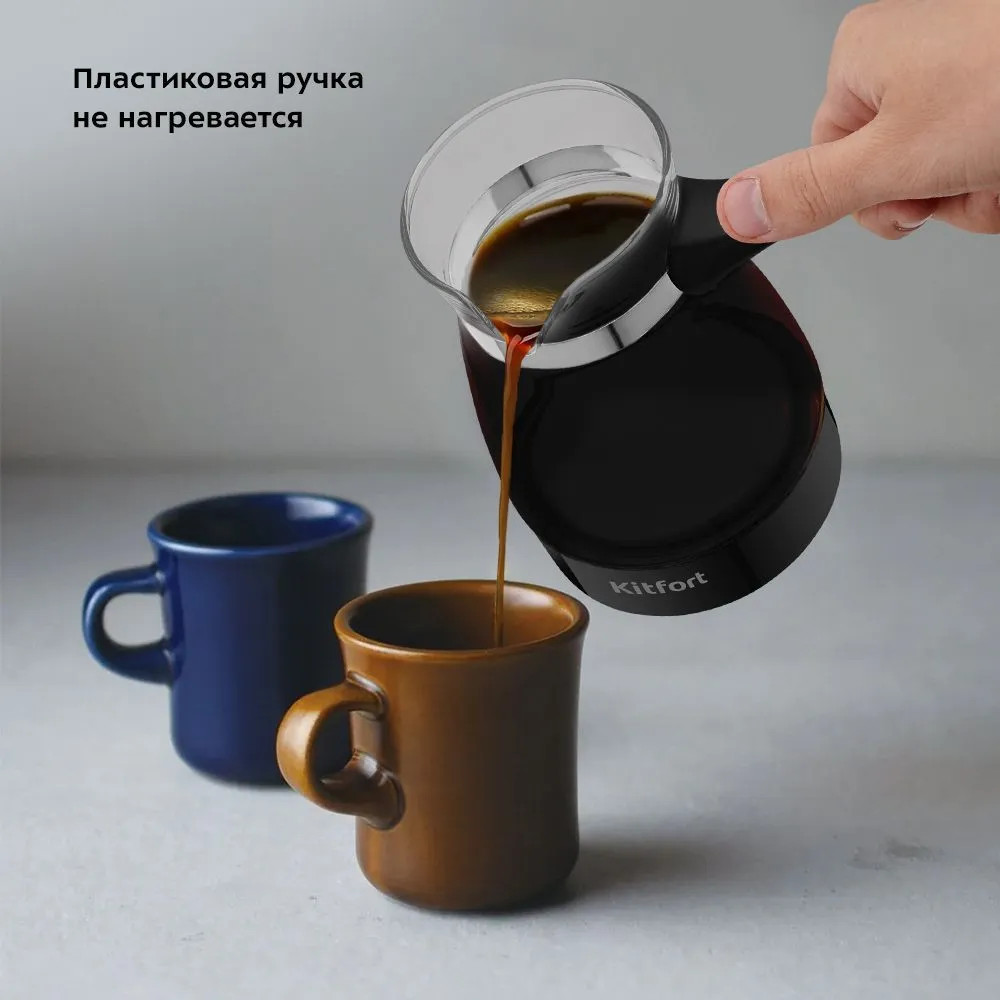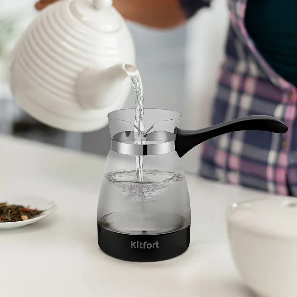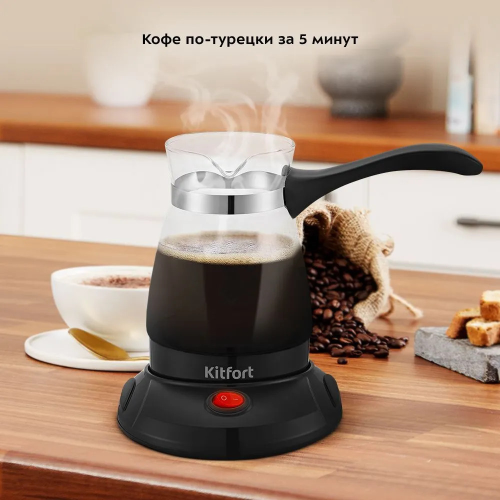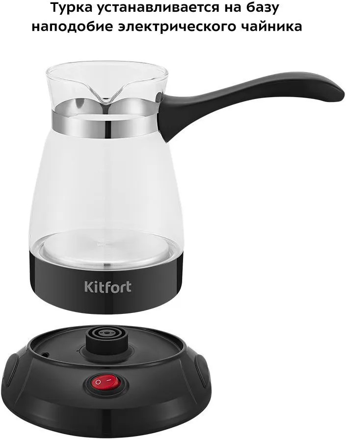 Электрическая турка КТ-7132 варит кофе по-турецки. С ней вы сможете быстро и легко сварить натуральный кофе на 7 чашек по 60 мл. Устройство состоит из базы и турки. Кофе по-восточному или кофе по-турецки — кофе, приготовленный путем варки мелкомолотых зерен кофе в воде. Чтобы сварить кофе по-турецки, в турку засыпают молотый кофе, заливают воду и нагревают её почти до кипения.