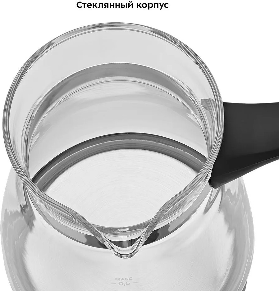 Ручка турки пластиковая, не нагревается и удобно лежит в руке. Электрическая турка состоит из базы и турки. На базе и на дне турки находятся электрические контакты. Турка устанавливается на базу наподобие электрического чайника. Благодаря стеклянному корпусу хорошо виден уровень воды. Ёмкость турки 500 мл.